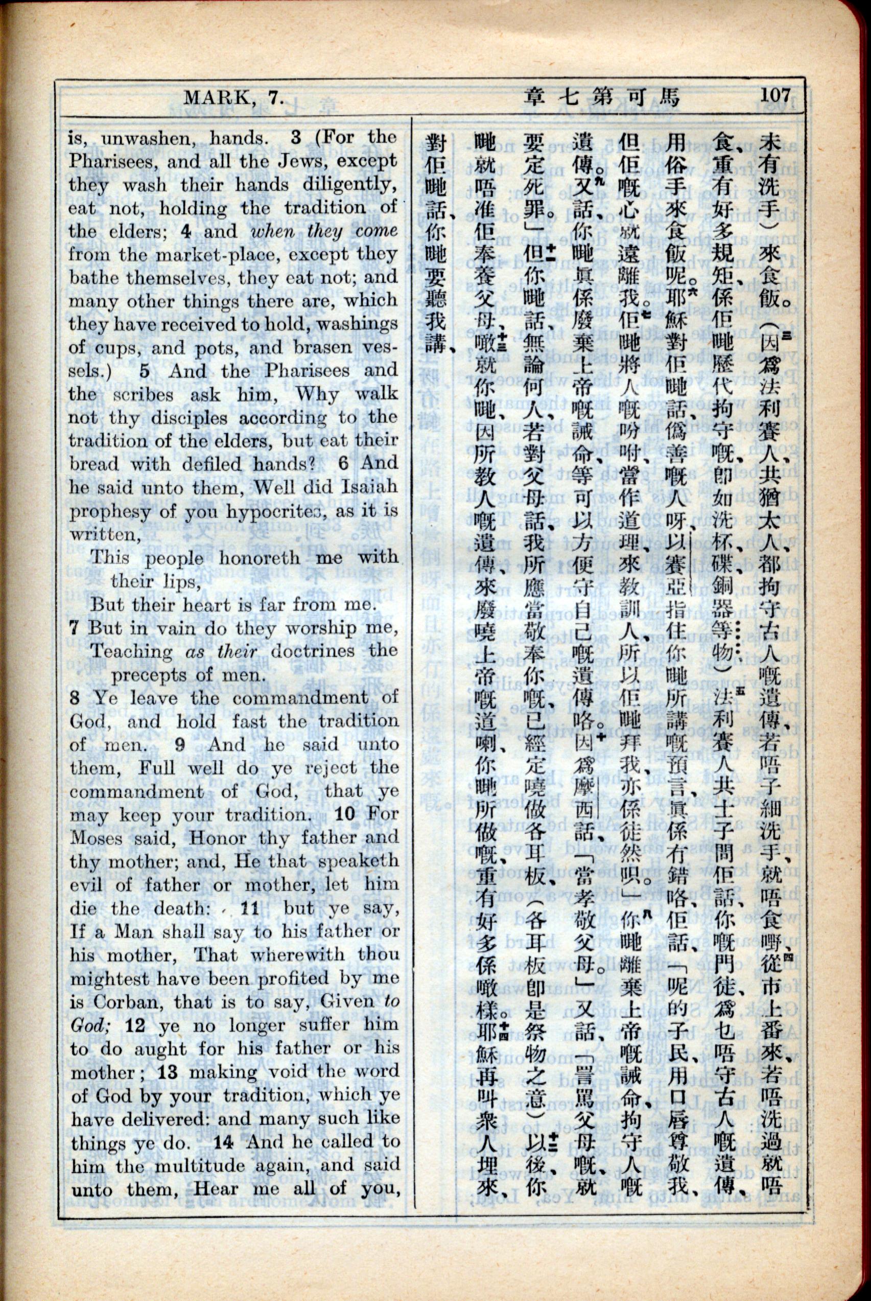 1931年新約全書廣東話新譯本與美國新譯英文 馬可福音 7 章 3 節到 7 章 14 節