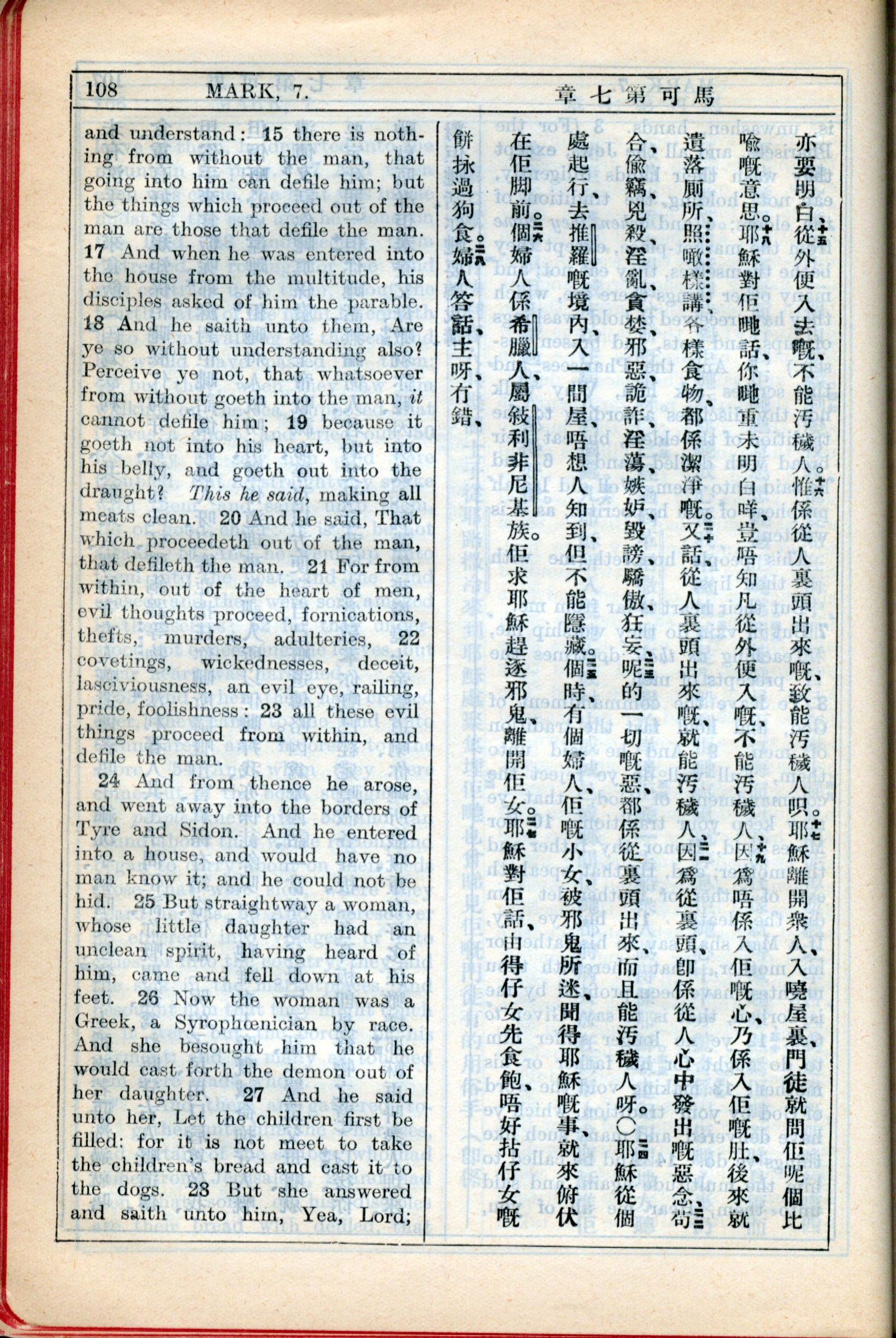 1931年新約全書廣東話新譯本與美國新譯英文 馬可福音 7 章 15 節到 7 章 23 節