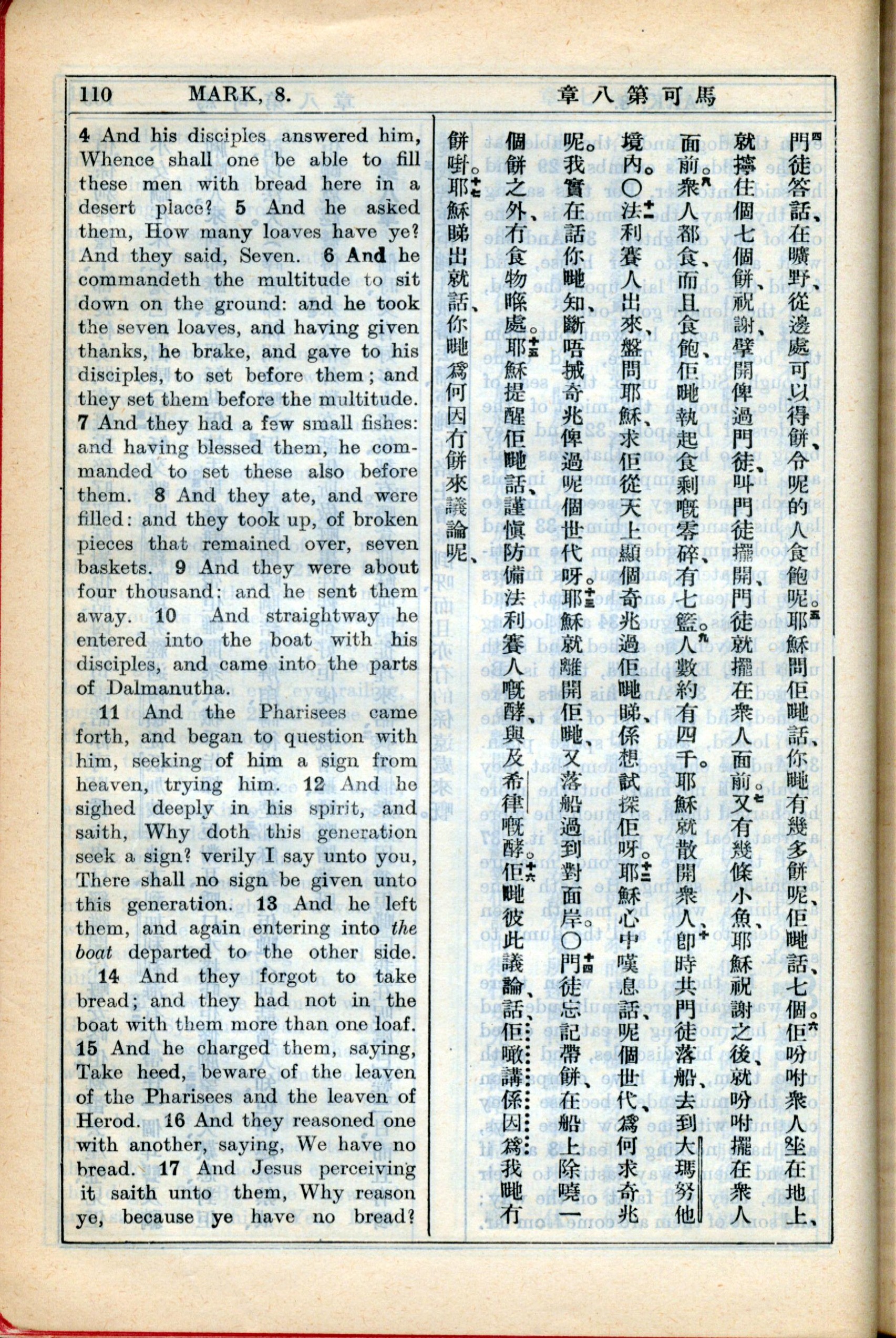 1931年新約全書廣東話新譯本與美國新譯英文 馬可福音 8 章 4 節到 8 章 17 節