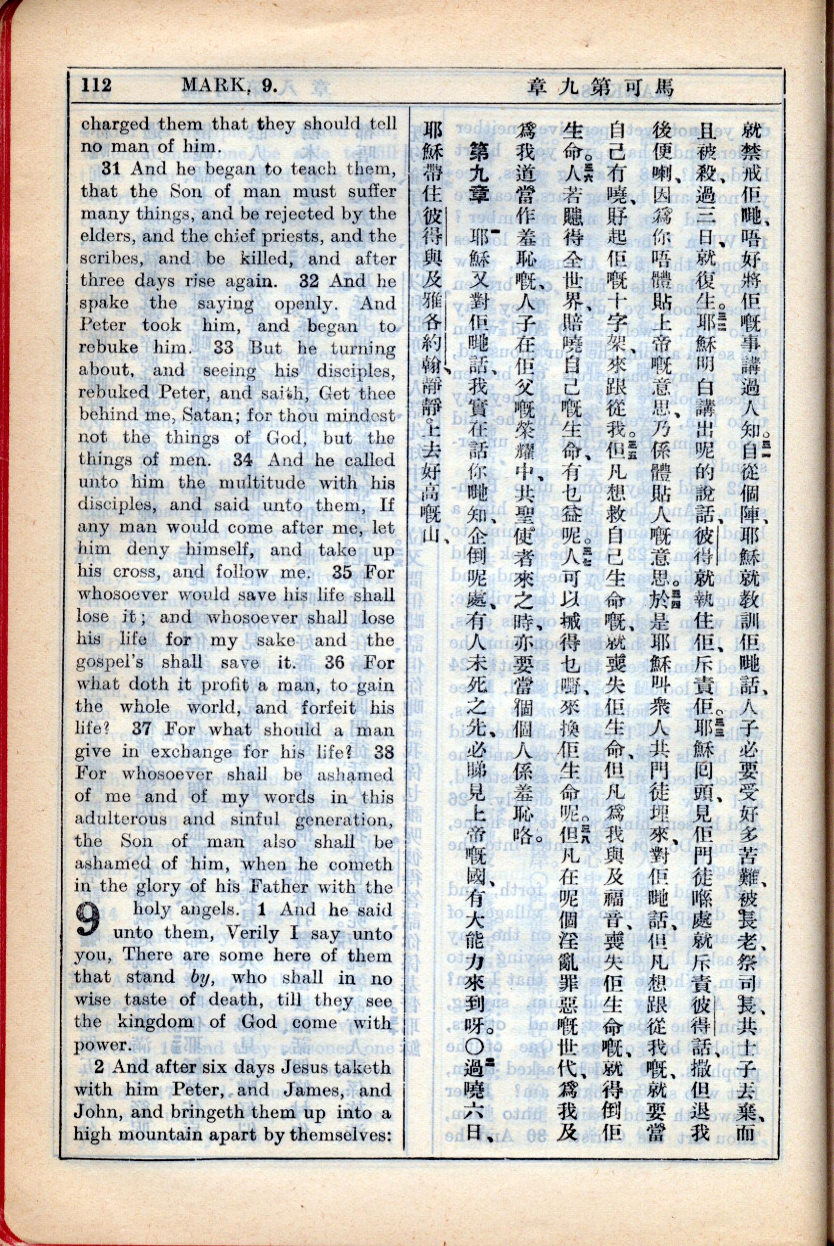 1931年新約全書廣東話新譯本與美國新譯英文 馬可福音 8 章 30 節到 9 章 2 節