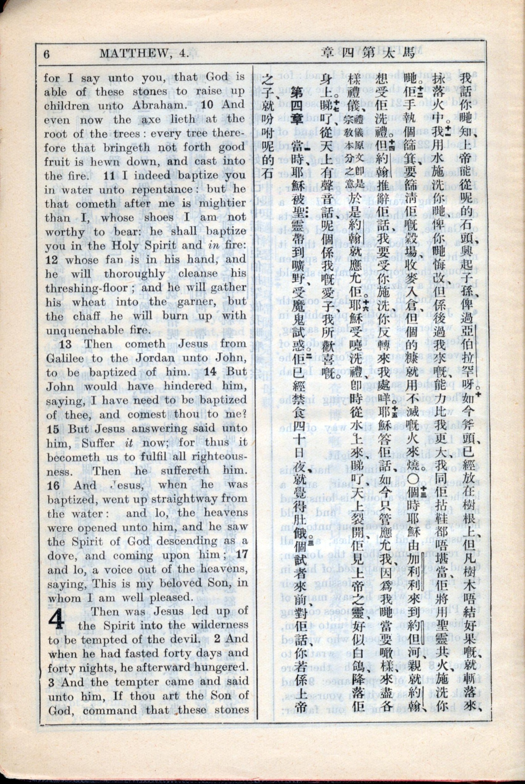 1931年新約全書廣東話新譯本與美國新譯英文 馬太福音 3 章 10 節到 4 章 3 節