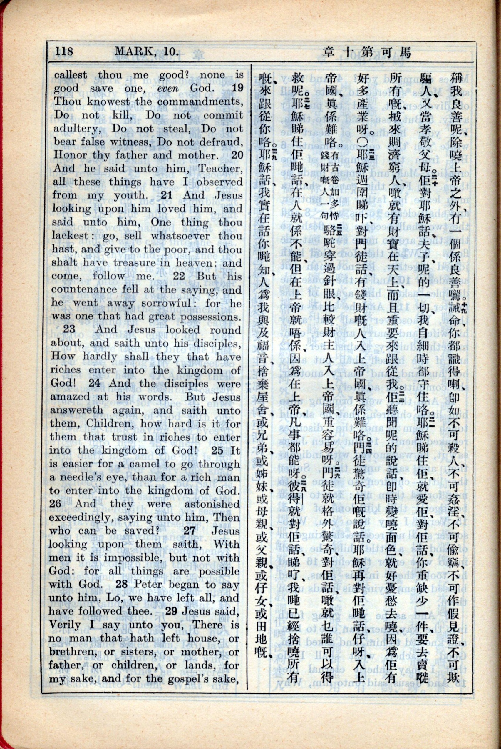 1931年新約全書廣東話新譯本與美國新譯英文 馬可福音 10 章 19 節到 10 章 29 節