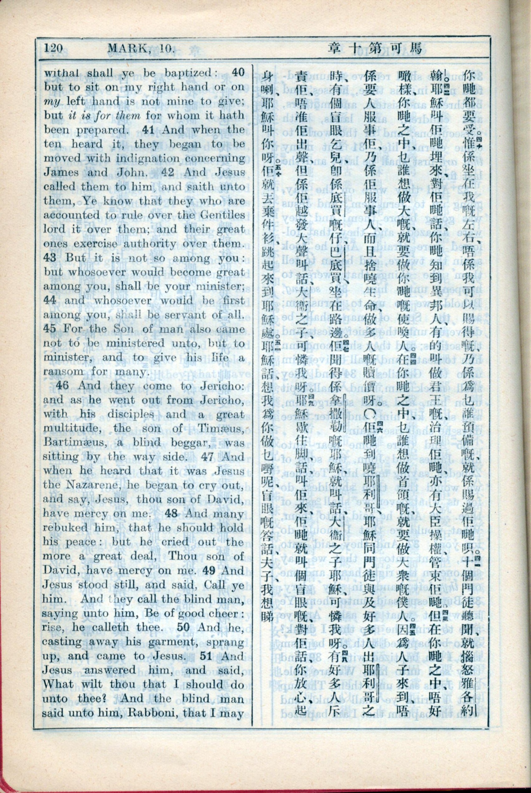 1931年新約全書廣東話新譯本與美國新譯英文 馬可福音 10 章 40 節到 10 章 51 節