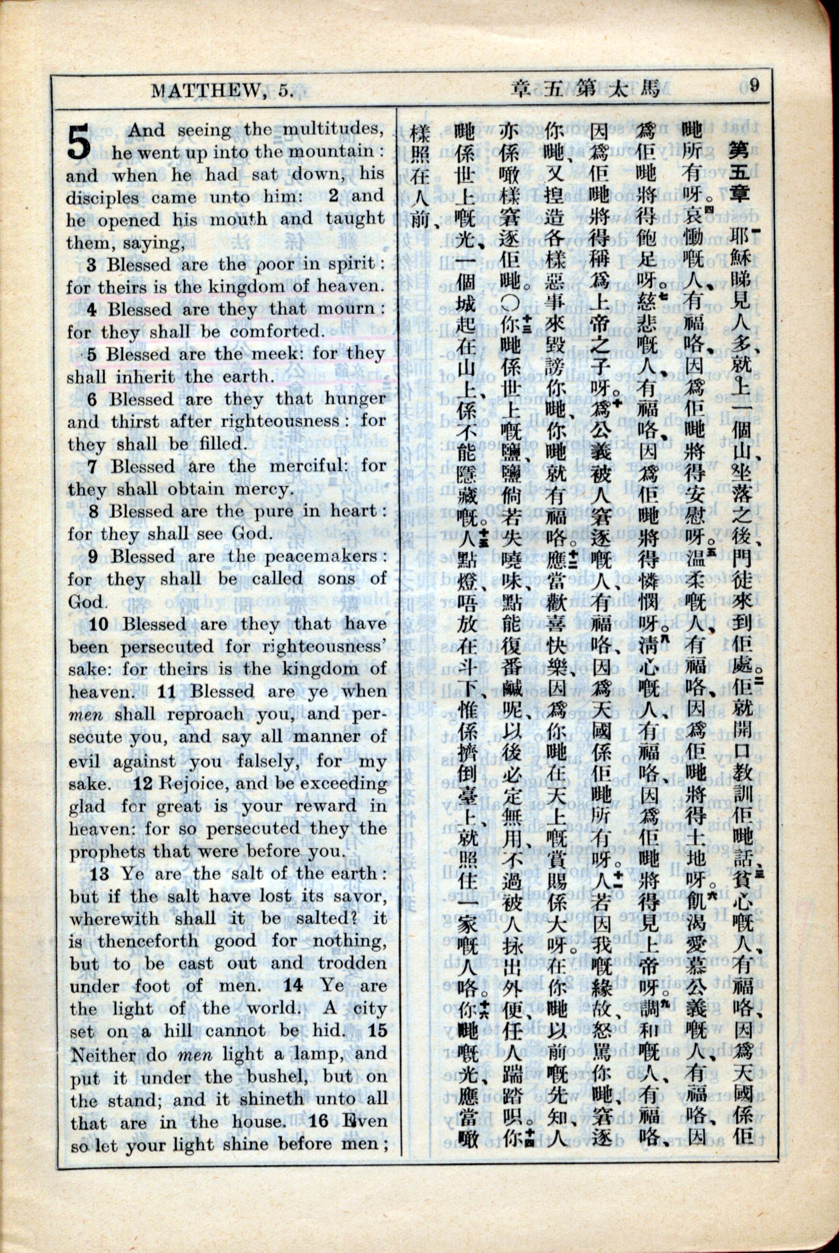 1931年新約全書廣東話新譯本與美國新譯英文 馬太福音 5 章 1 節到 5 章 16 節