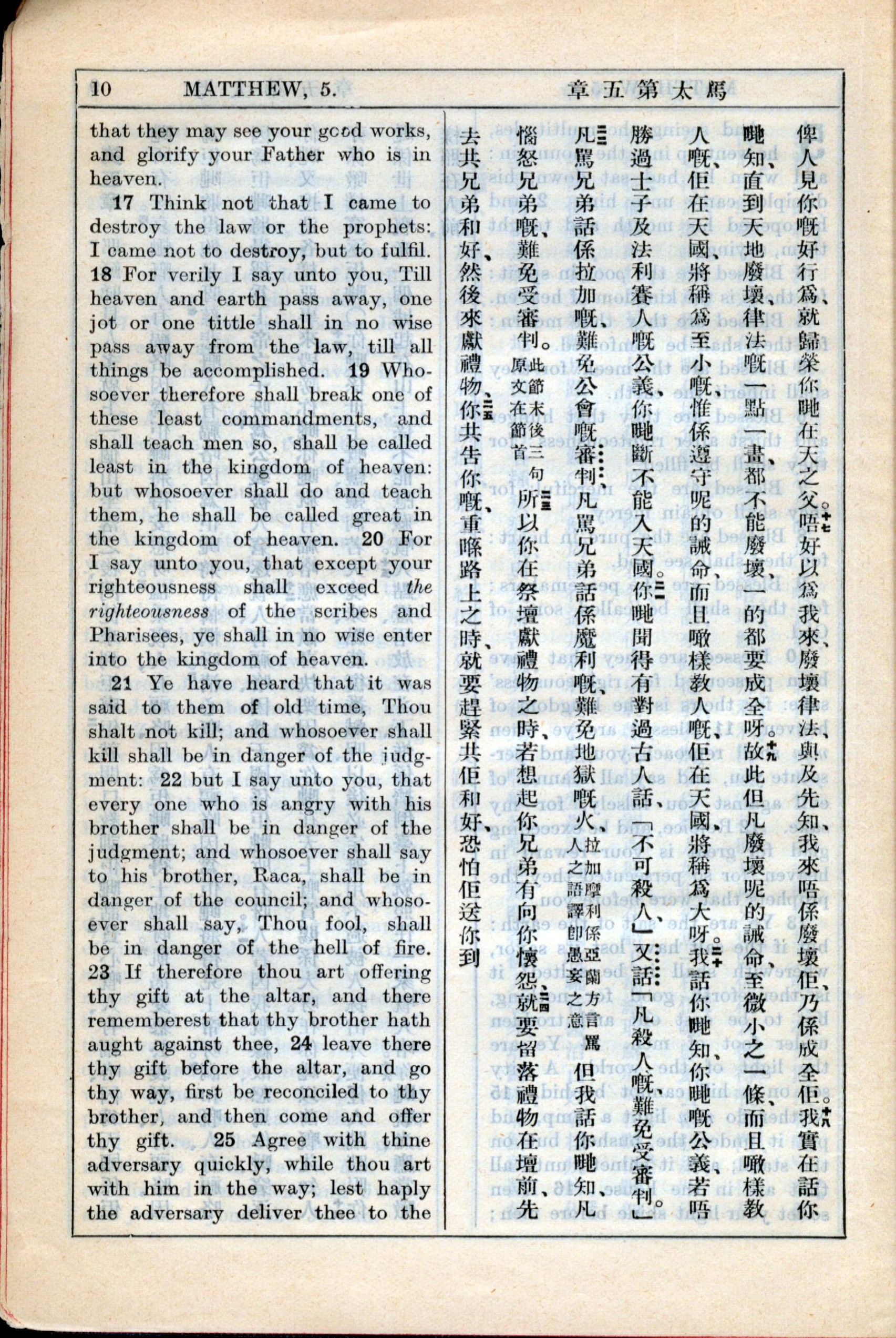 1931年新約全書廣東話新譯本與美國新譯英文 馬太福音 5 章 17 節到 5 章 25 節