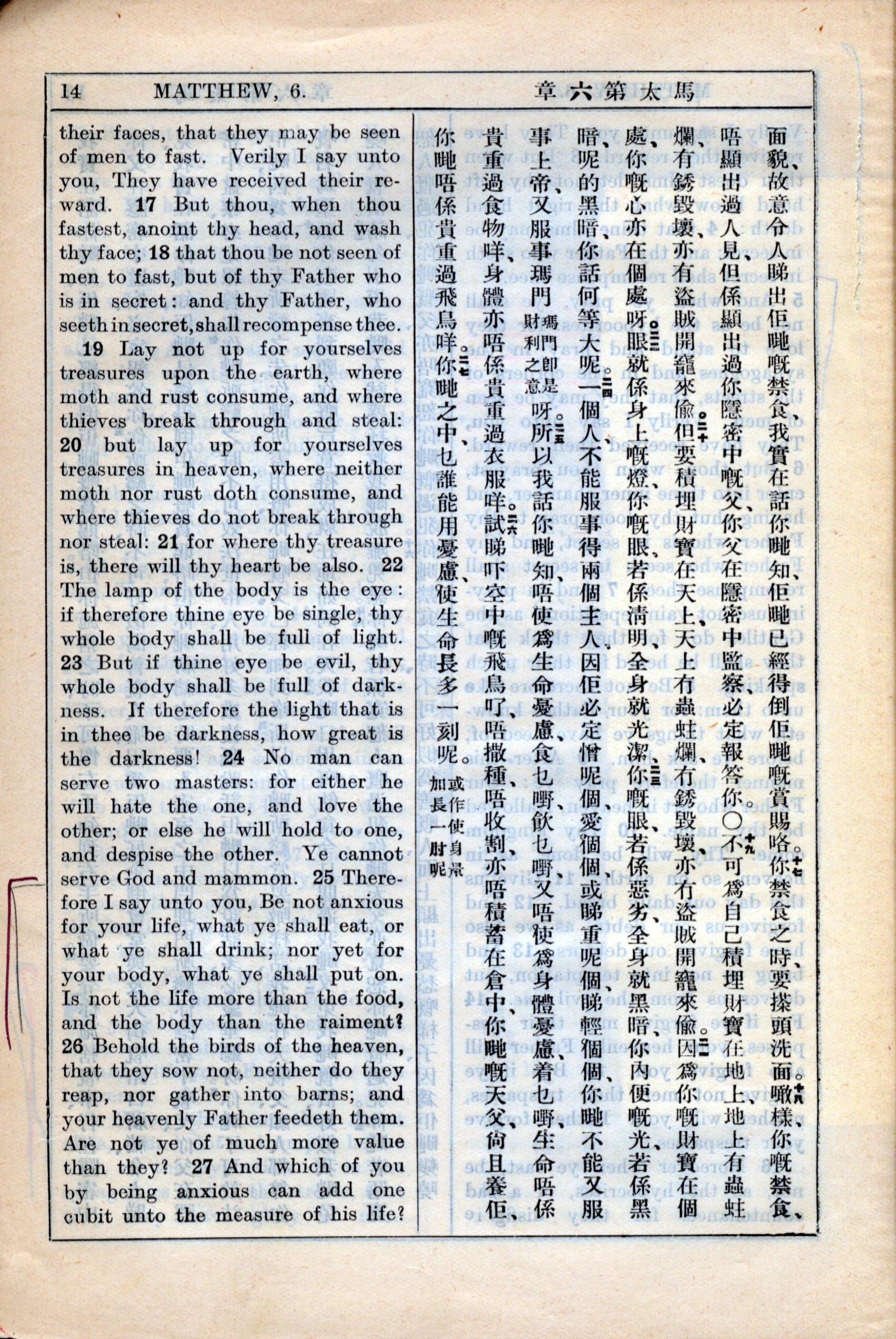 1931年新約全書廣東話新譯本與美國新譯英文 馬太福音 6 章 17 節到 6 章 27 節