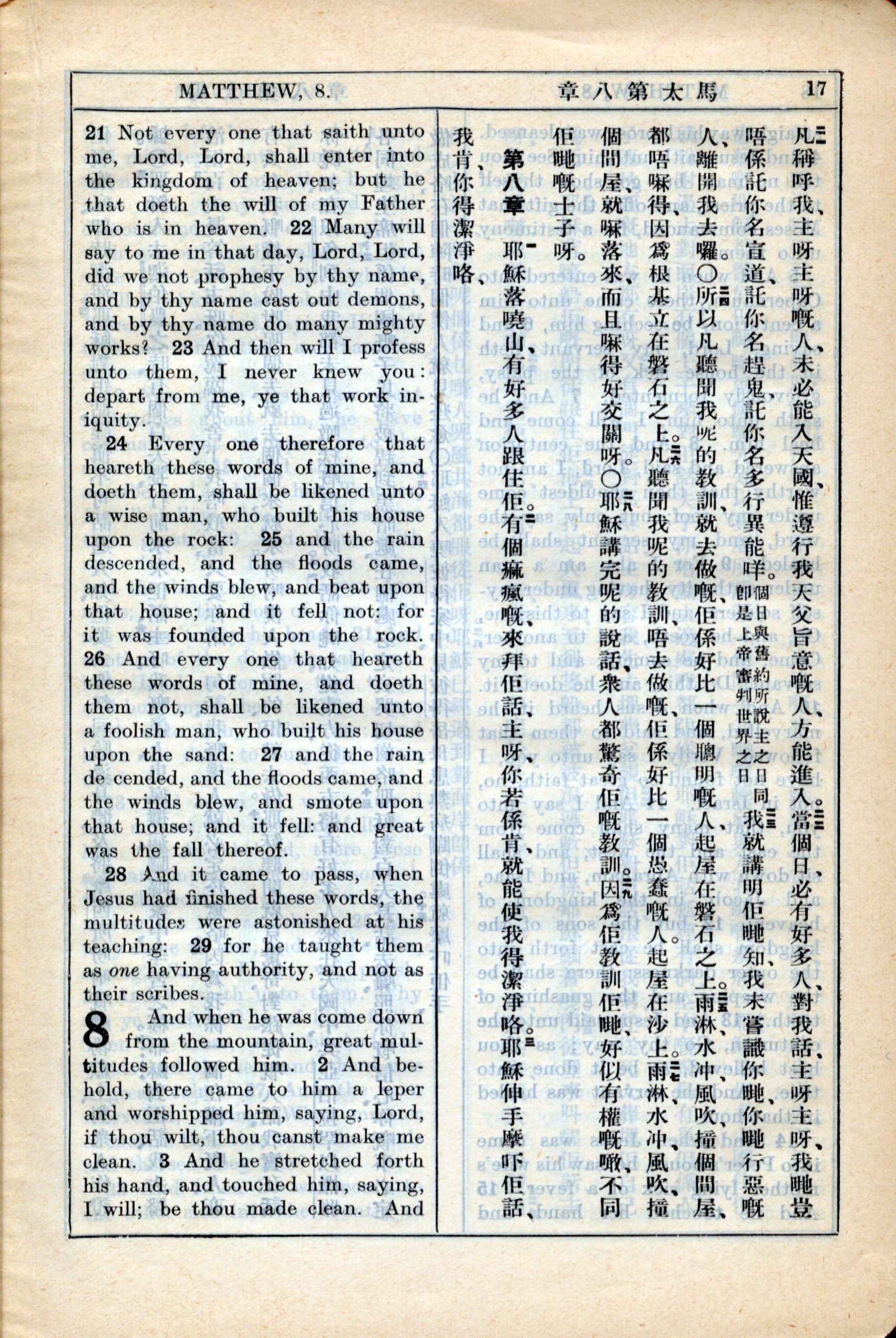 1931年新約全書廣東話新譯本與美國新譯英文 馬太福音 7 章 21 節到 8 章 3 節