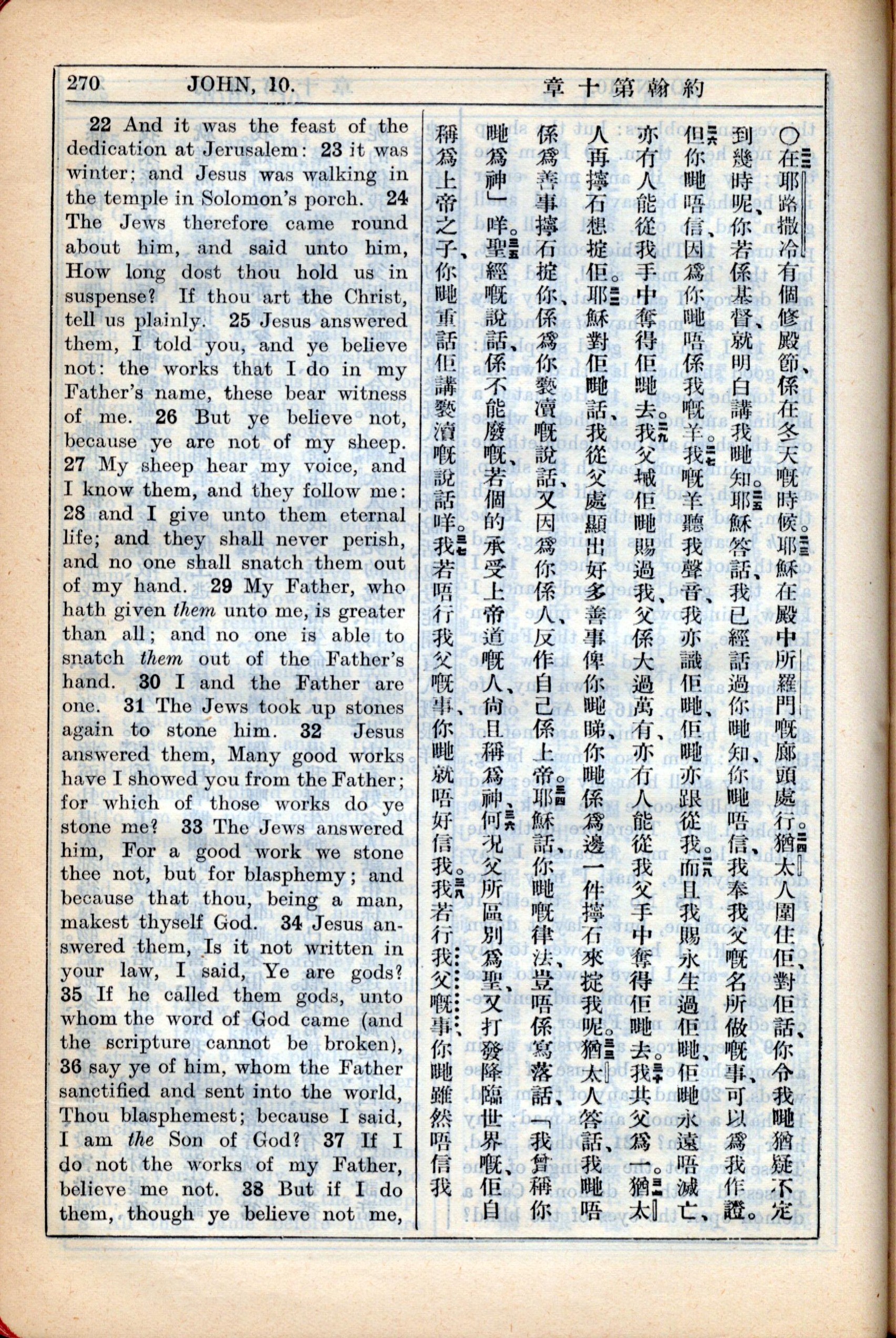 1931年新約全書廣東話新譯本與美國新譯英文 約翰福音 10 章 22 節到 10 章 38 節