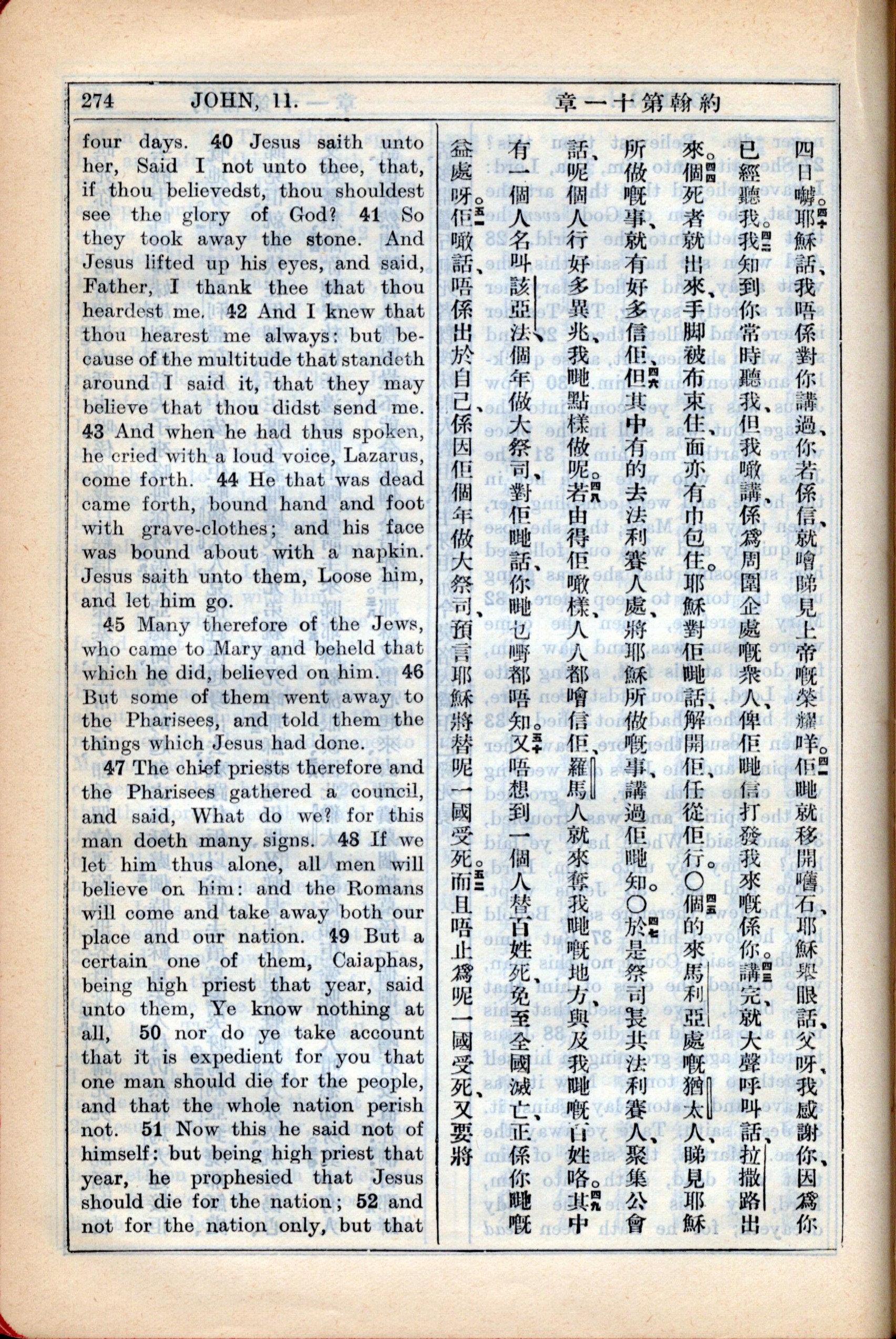 1931年新約全書廣東話新譯本與美國新譯英文 約翰福音 11 章 40 節到 11 章 52 節