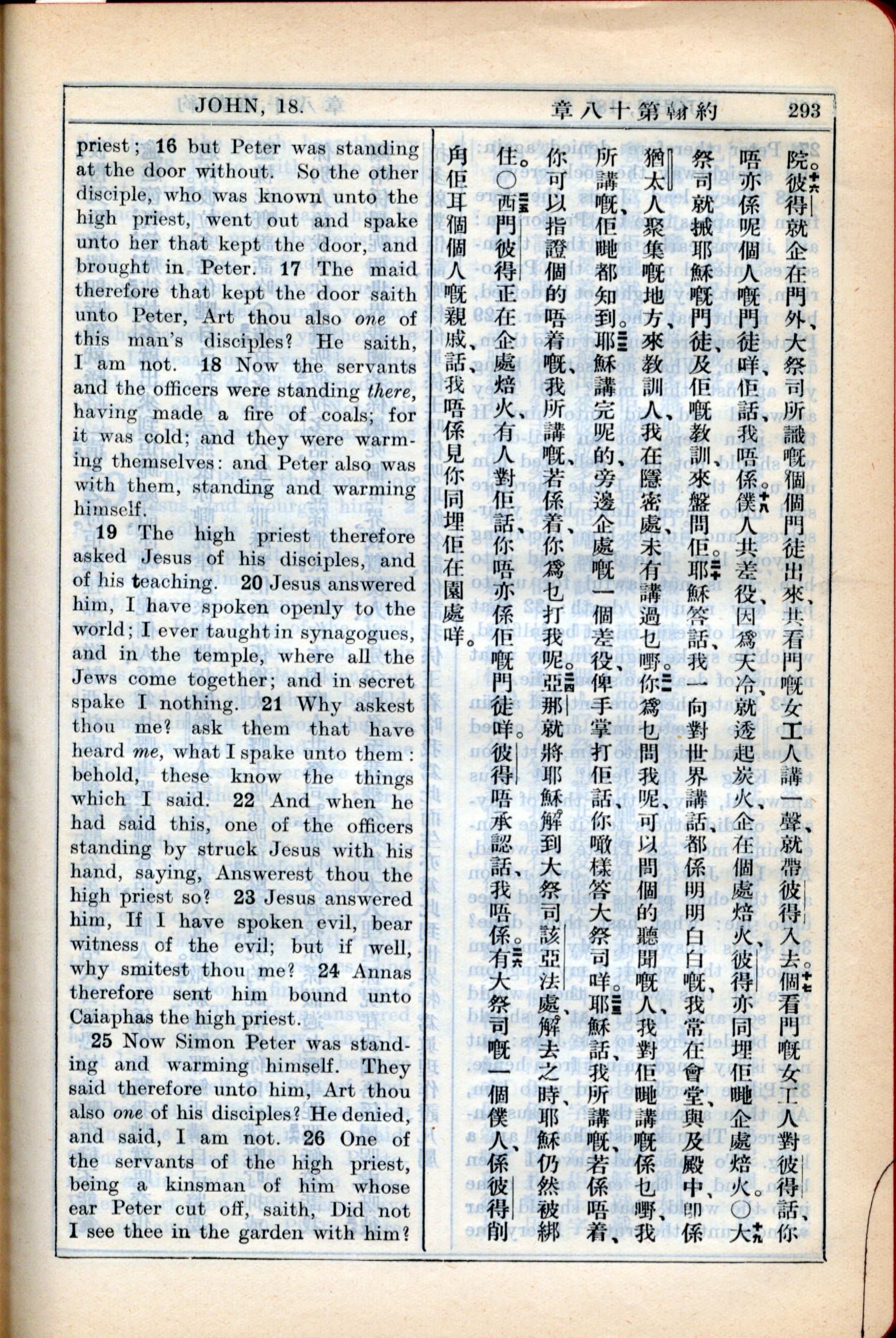 1931年新約全書廣東話新譯本與美國新譯英文 約翰福音 18 章 16 節到 18 章 26 節