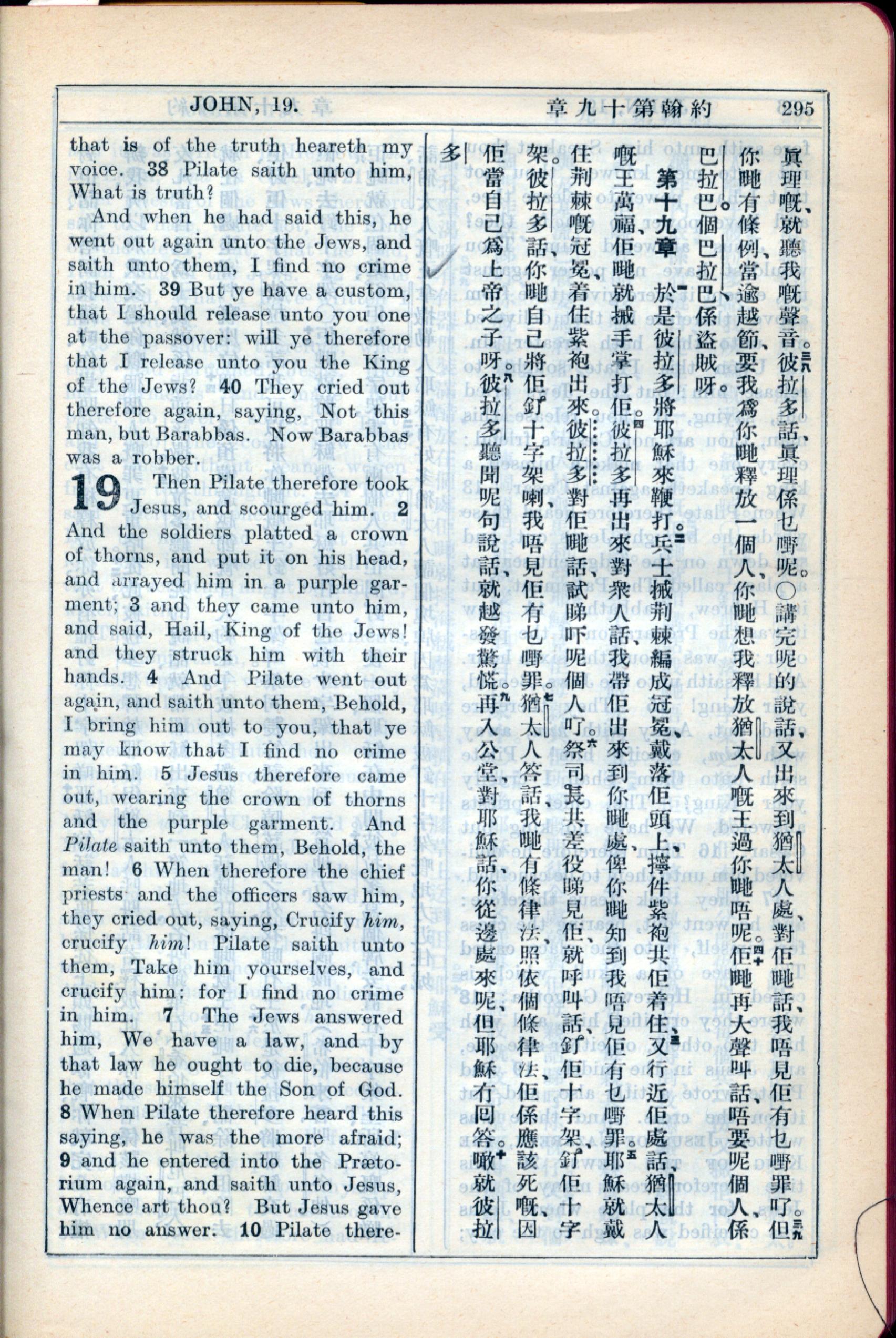 1931年新約全書廣東話新譯本與美國新譯英文 約翰福音 18 章 38 節到 19 章 9 節