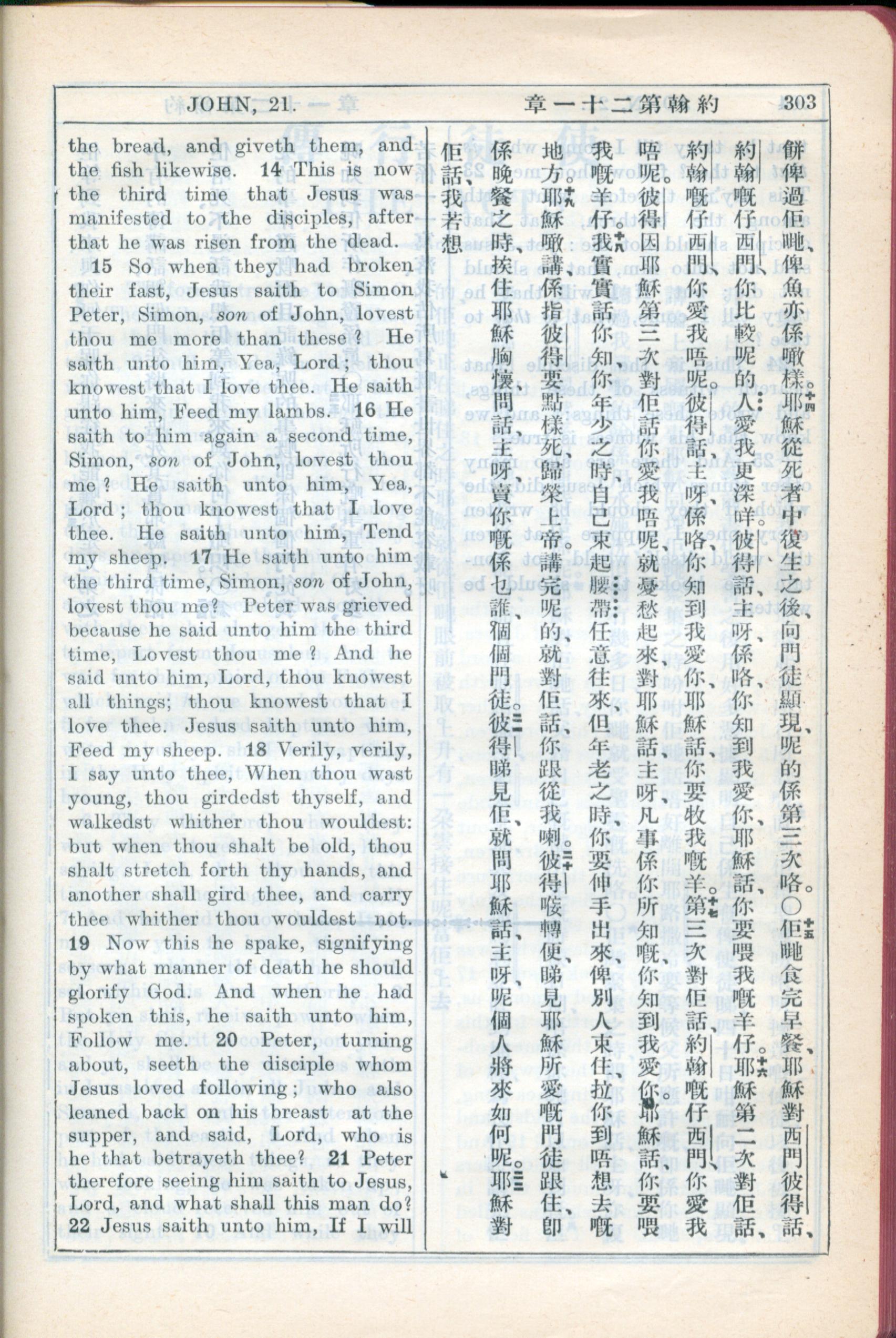 1931年新約全書廣東話新譯本與美國新譯英文 約翰福音 21 章 14 節到 21 章 22 節