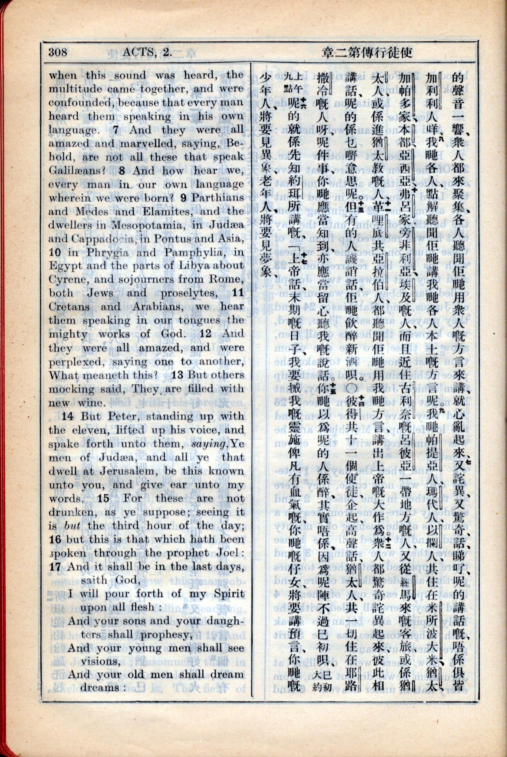 1931年新約全書廣東話新譯本與美國新譯英文 使徒行傳 2 章 6 節到 2 章 17 節