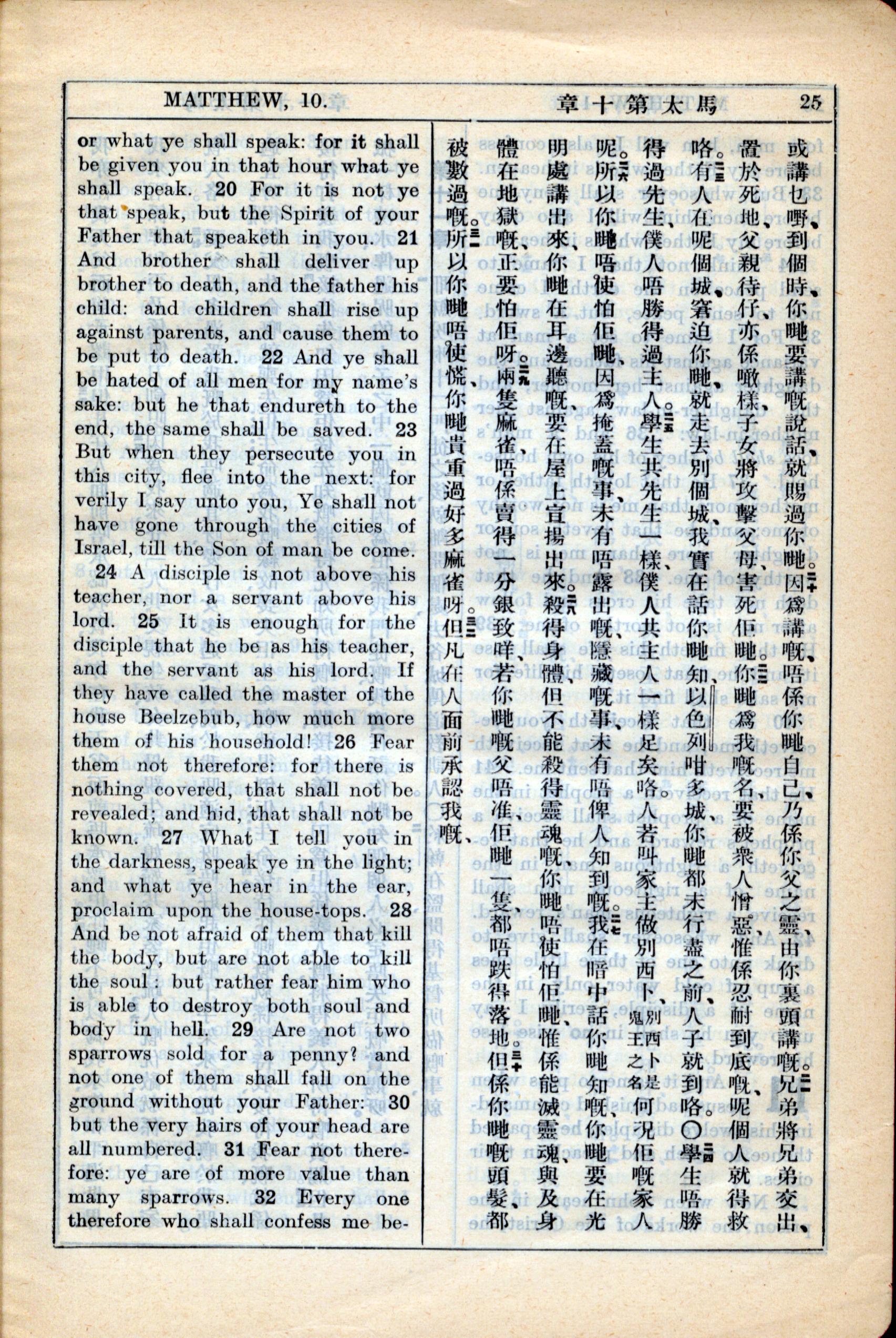 1931年新約全書廣東話新譯本與美國新譯英文 馬太福音 10 章 20 節到 10 章 32 節
