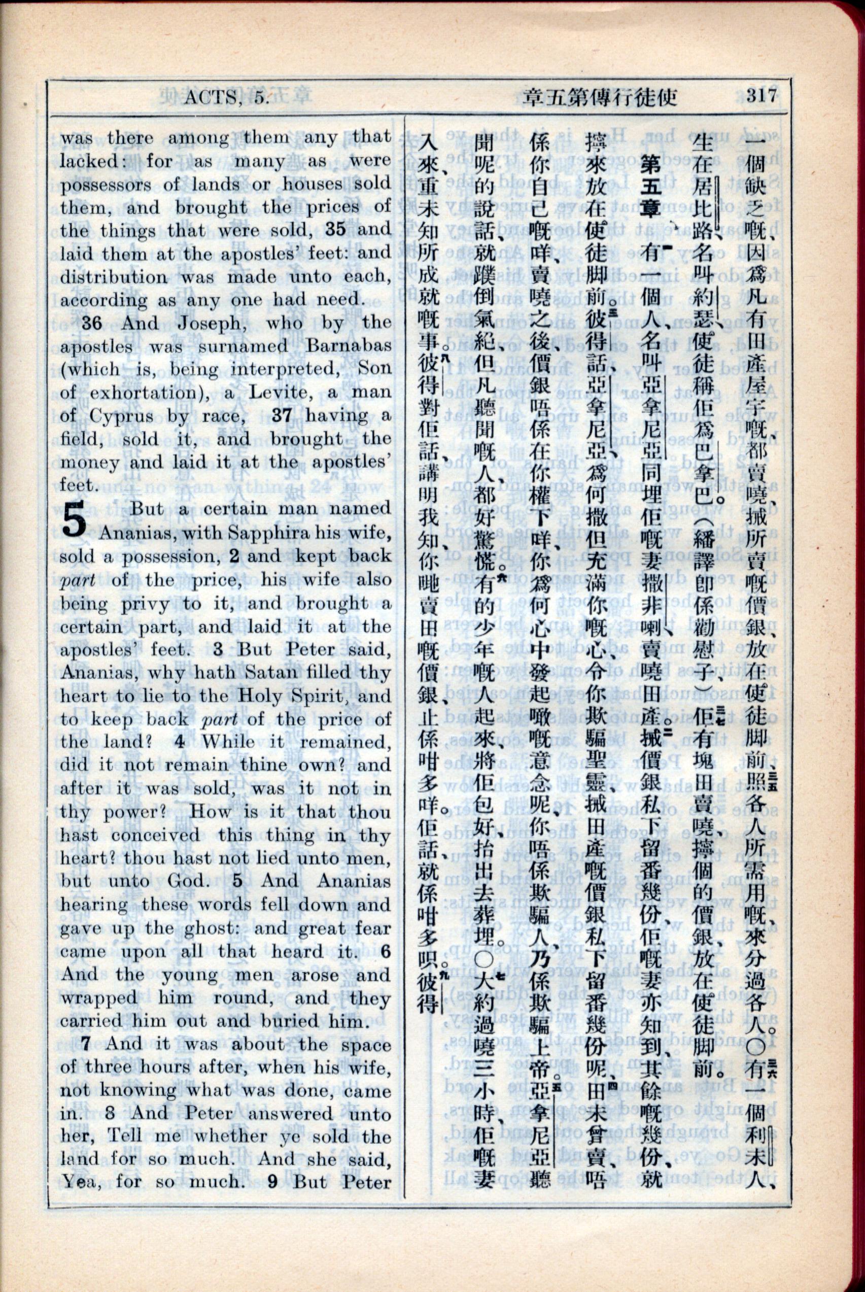 1931年新約全書廣東話新譯本與美國新譯英文 使徒行傳 4 章 34 節到 5 章 8 節