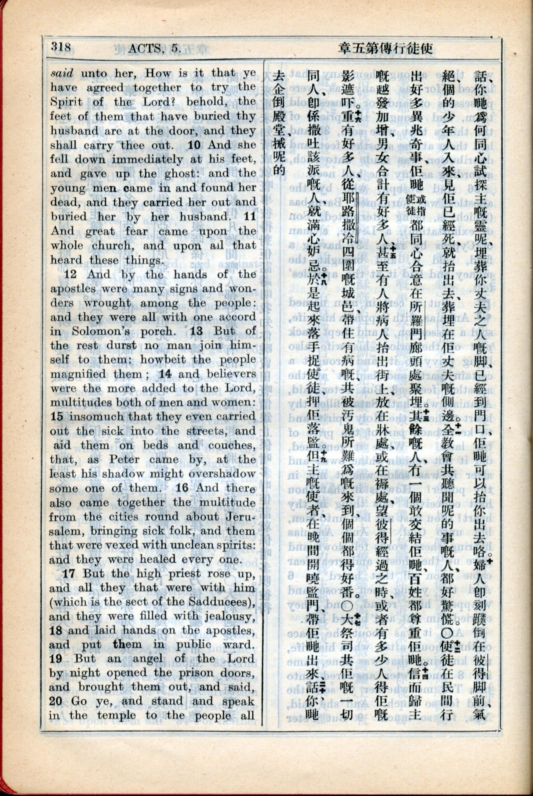 1931年新約全書廣東話新譯本與美國新譯英文 使徒行傳 5 章 9 節到 5 章 20 節