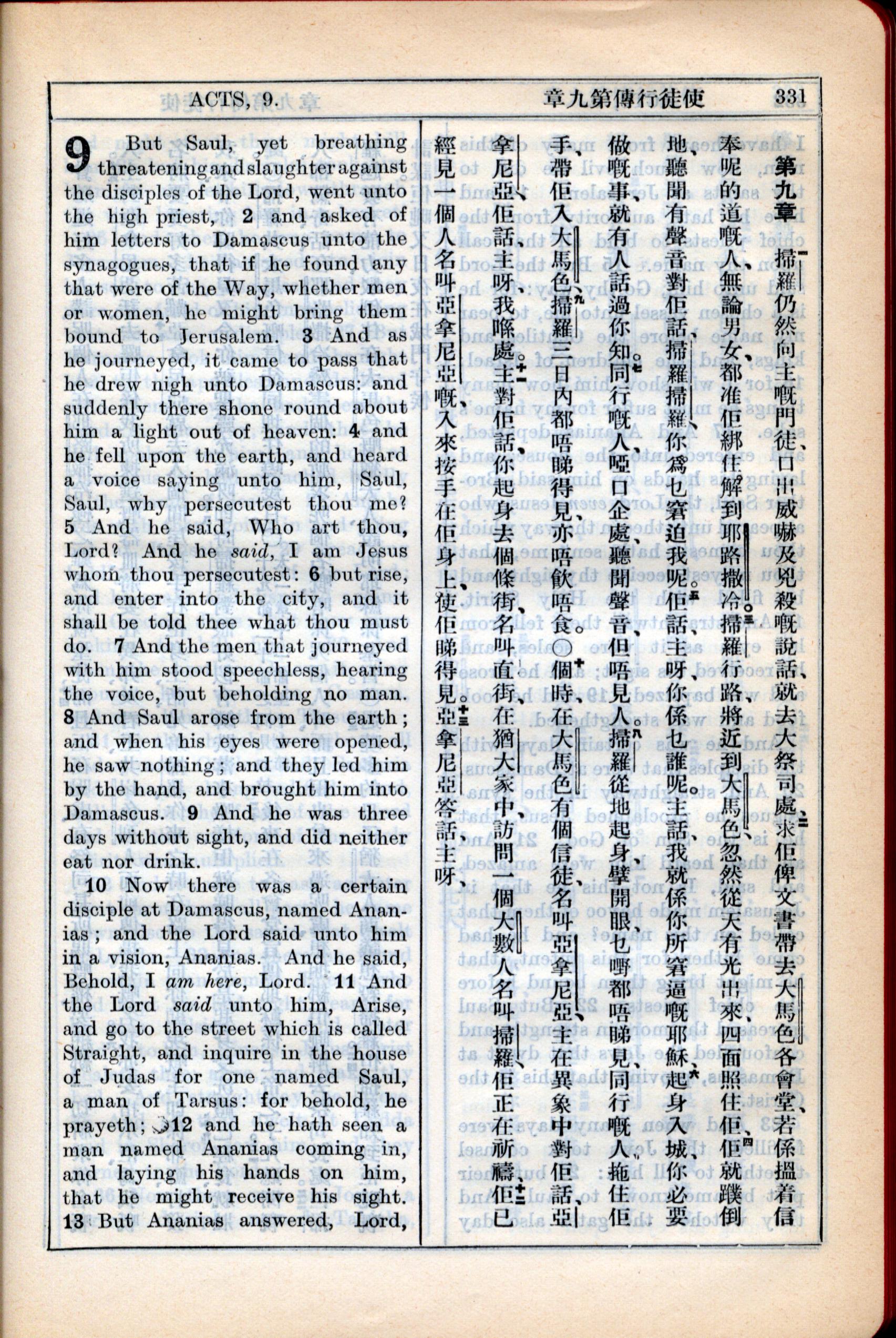 1931年新約全書廣東話新譯本與美國新譯英文 使徒行傳 9 章 1 節到 9 章 13 節