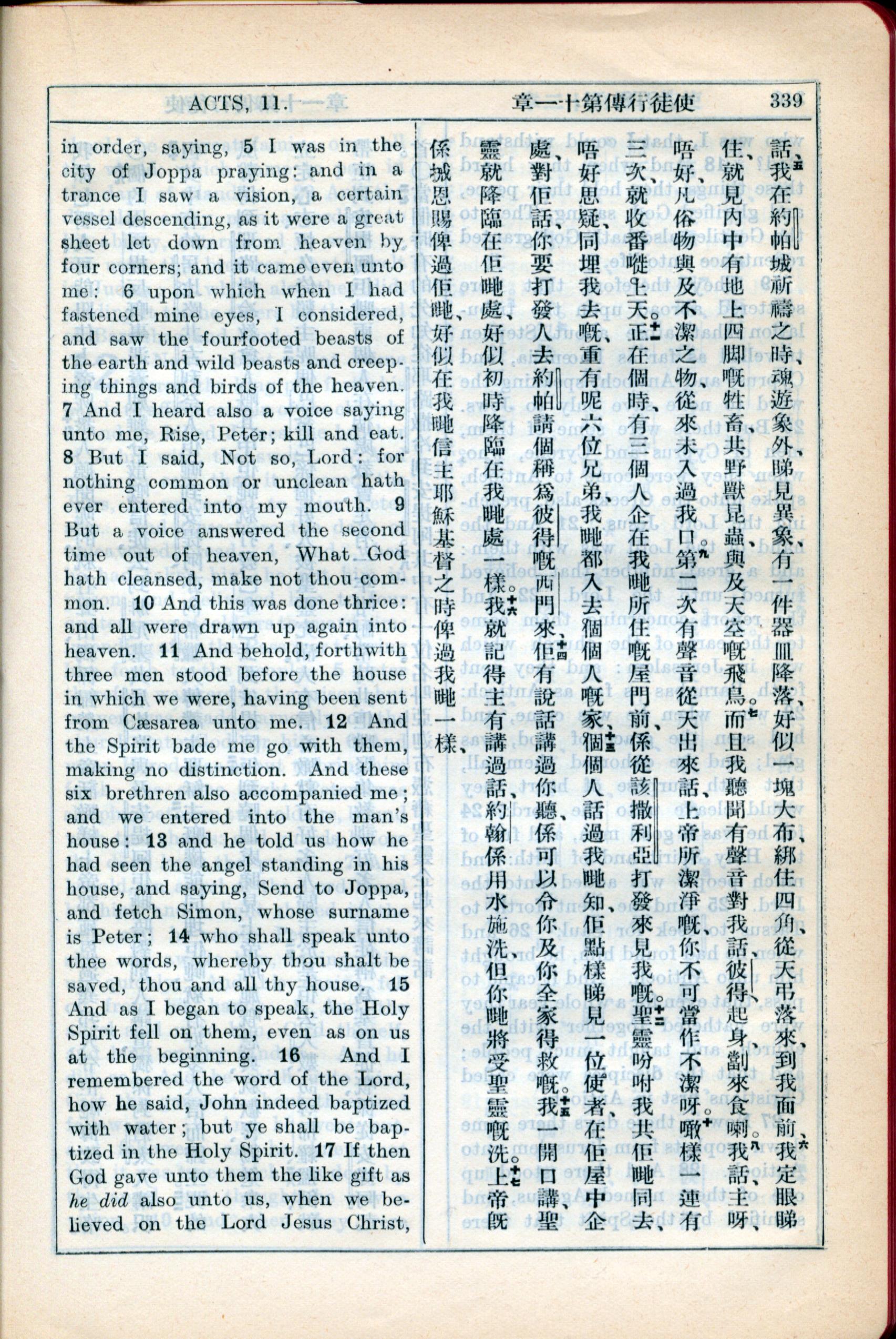 1931年新約全書廣東話新譯本與美國新譯英文 使徒行傳 11 章 5 節到 11 章 17 節