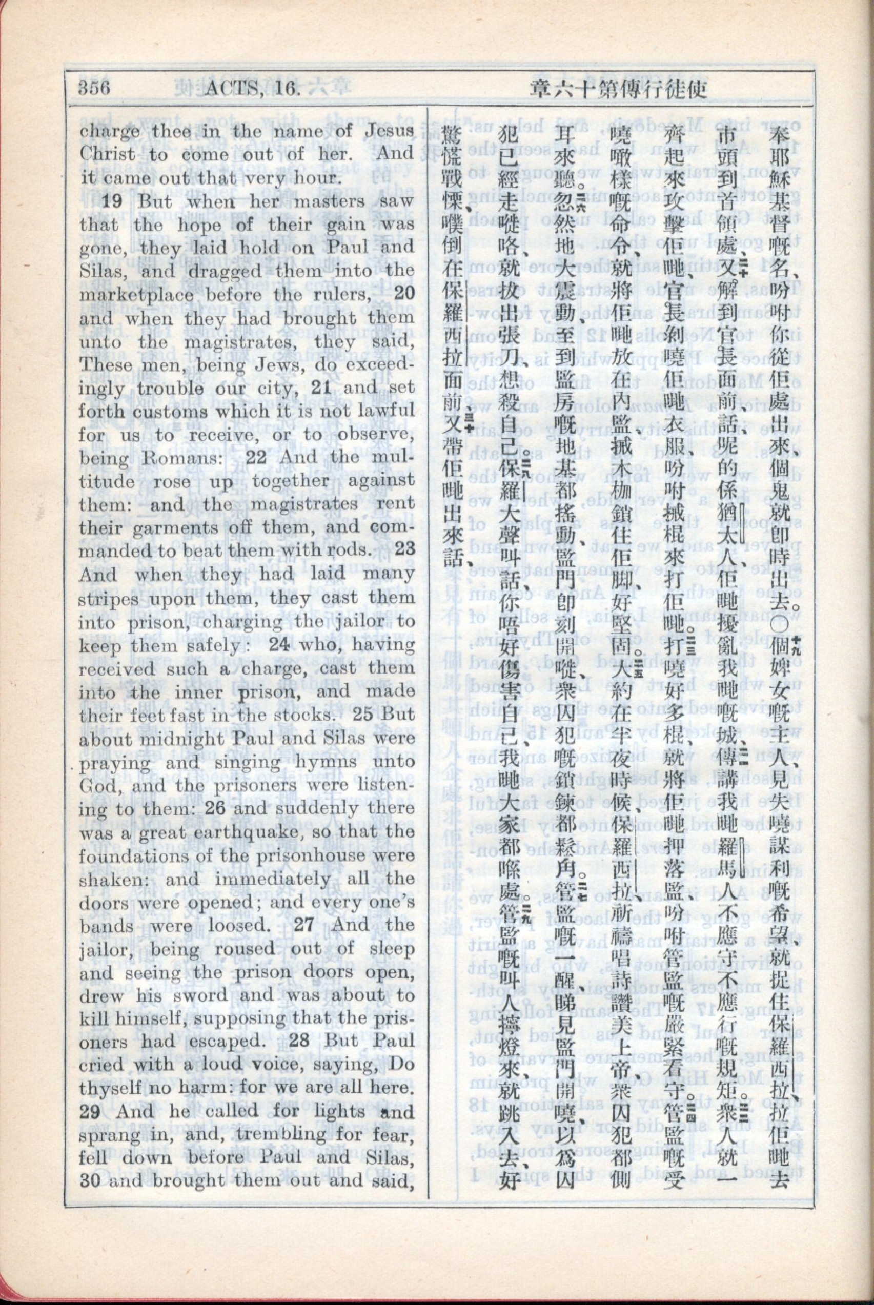 1931年新約全書廣東話新譯本與美國新譯英文 使徒行傳 16 章 19 節到 16 章 30 節