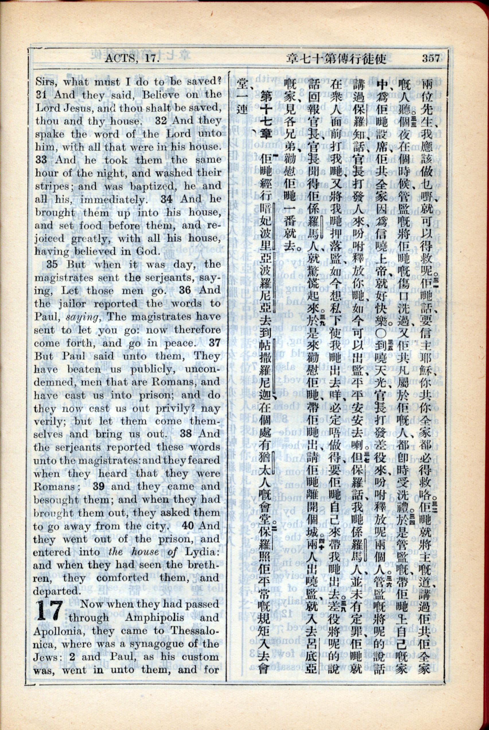 1931年新約全書廣東話新譯本與美國新譯英文 使徒行傳 16 章 31 節到 17 章 2 節