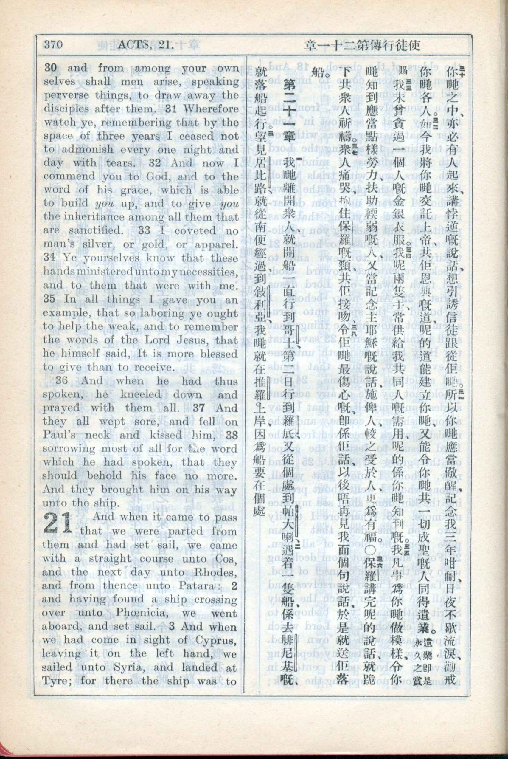 1931年新約全書廣東話新譯本與美國新譯英文 使徒行傳 20 章 30 節到 21 章 3 節