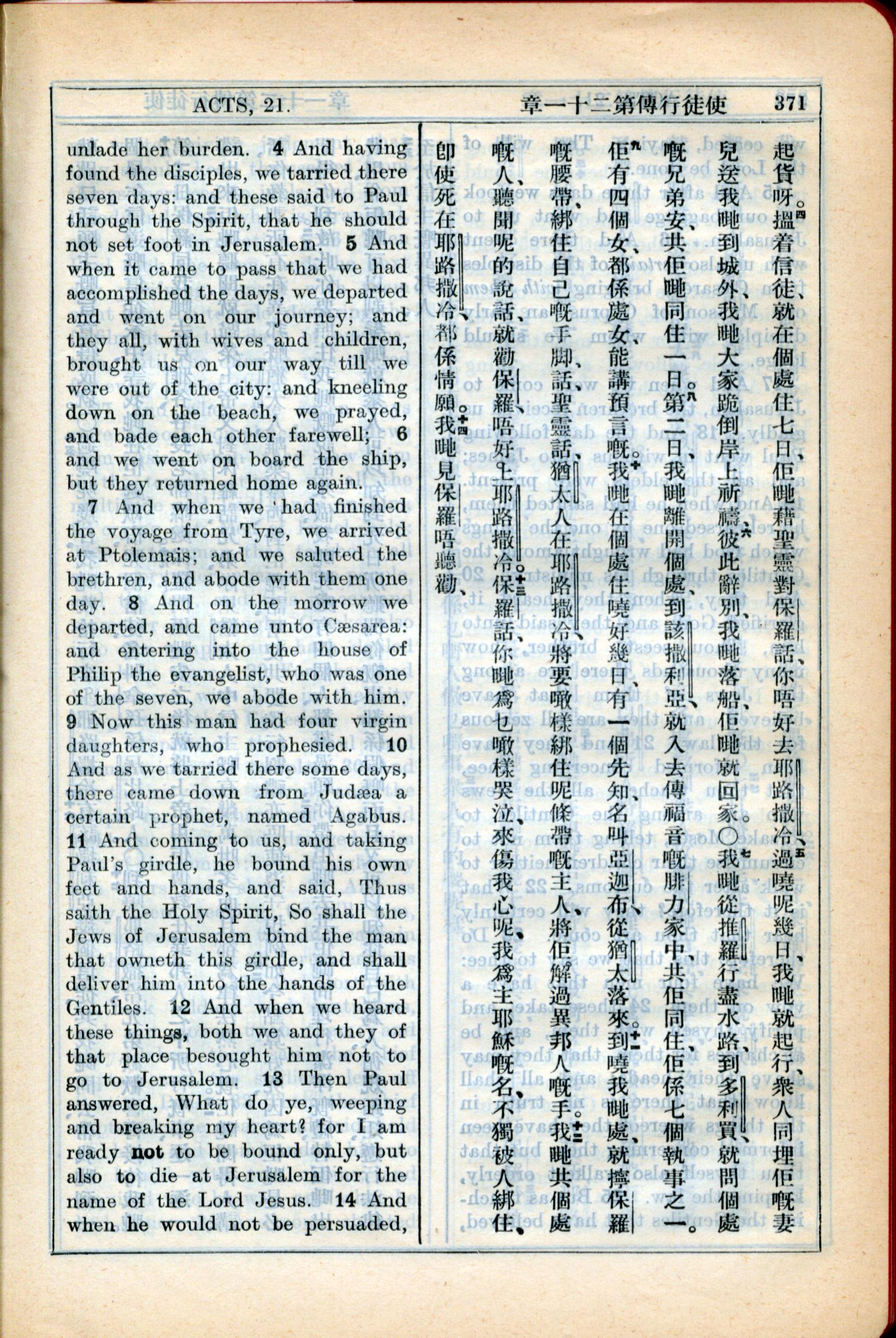 1931年新約全書廣東話新譯本與美國新譯英文 使徒行傳 21 章 4 節到 21 章 14 節