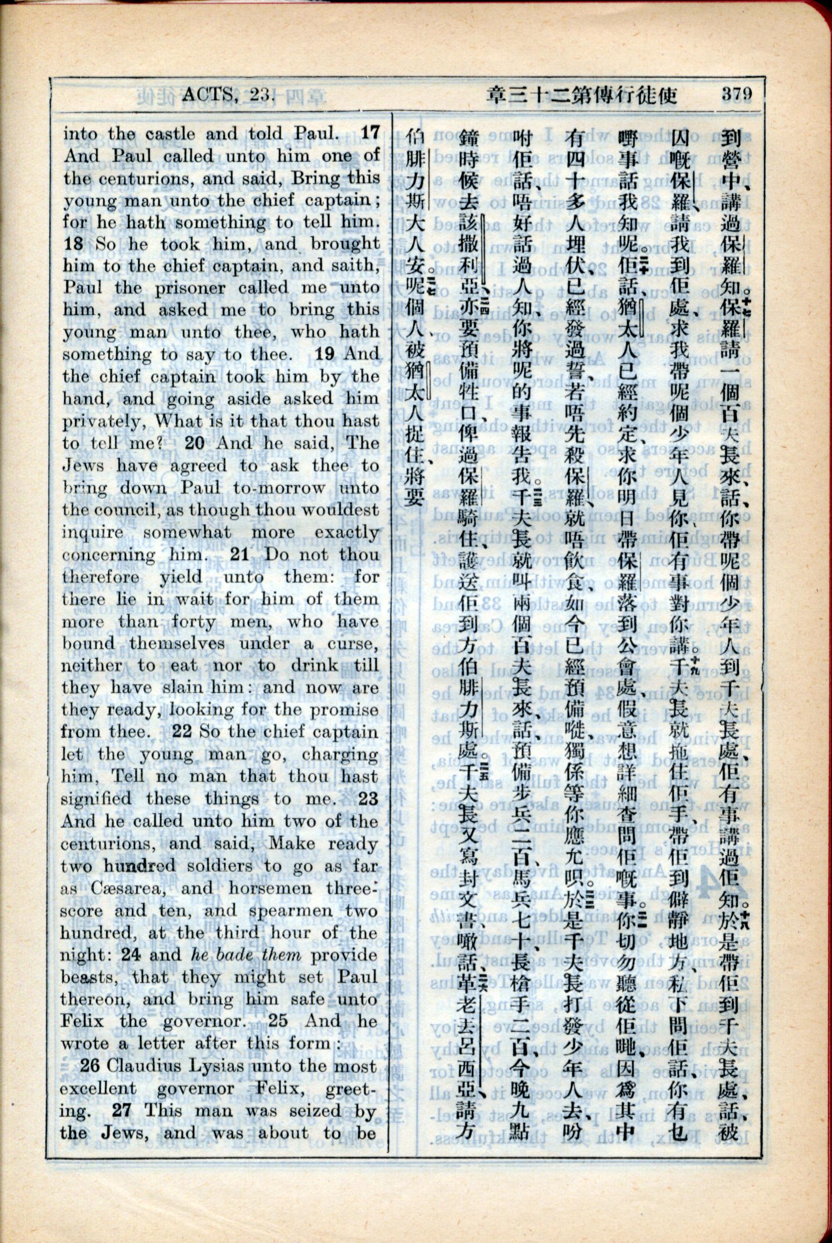 1931年新約全書廣東話新譯本與美國新譯英文 使徒行傳 23 章 17 節到 23 章 27 節