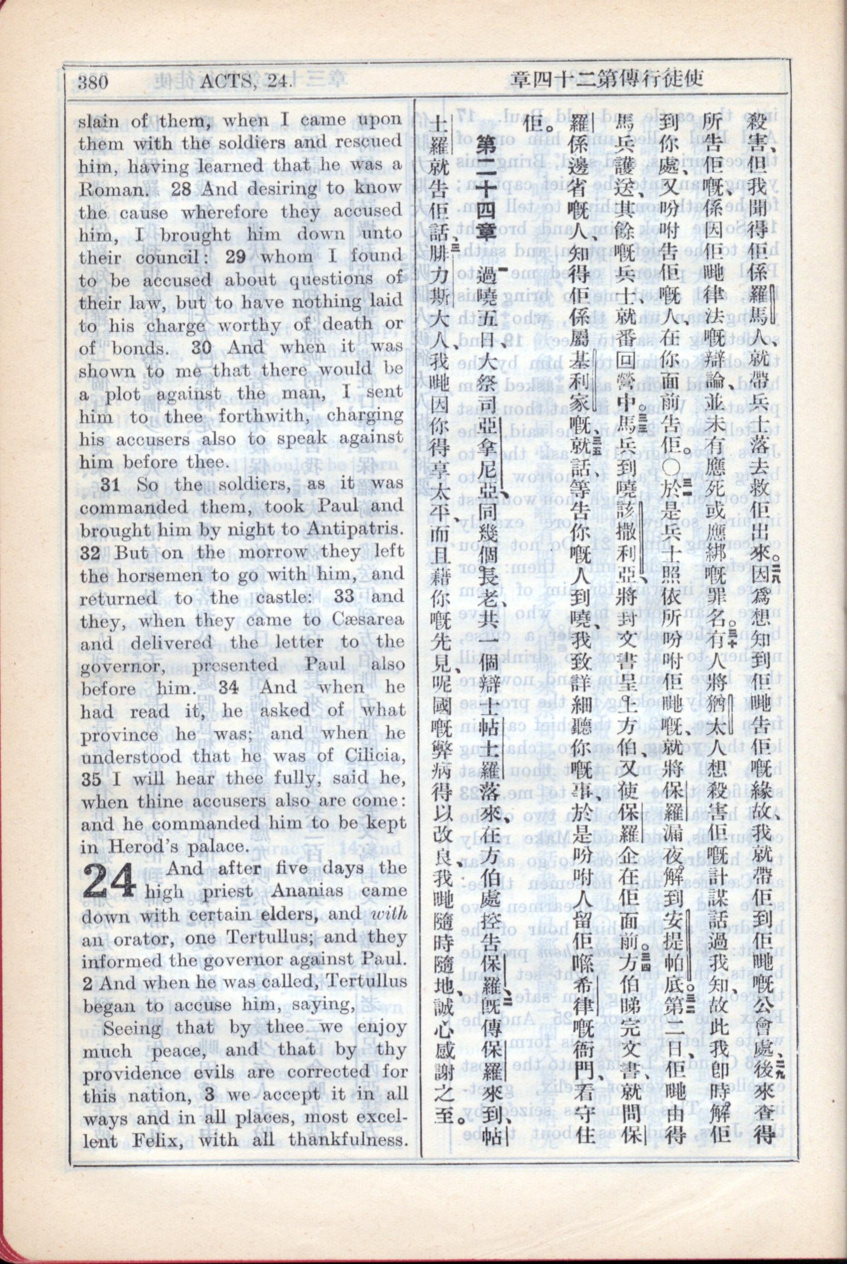 1931年新約全書廣東話新譯本與美國新譯英文 使徒行傳 23 章 28 節到 24 章 3 節