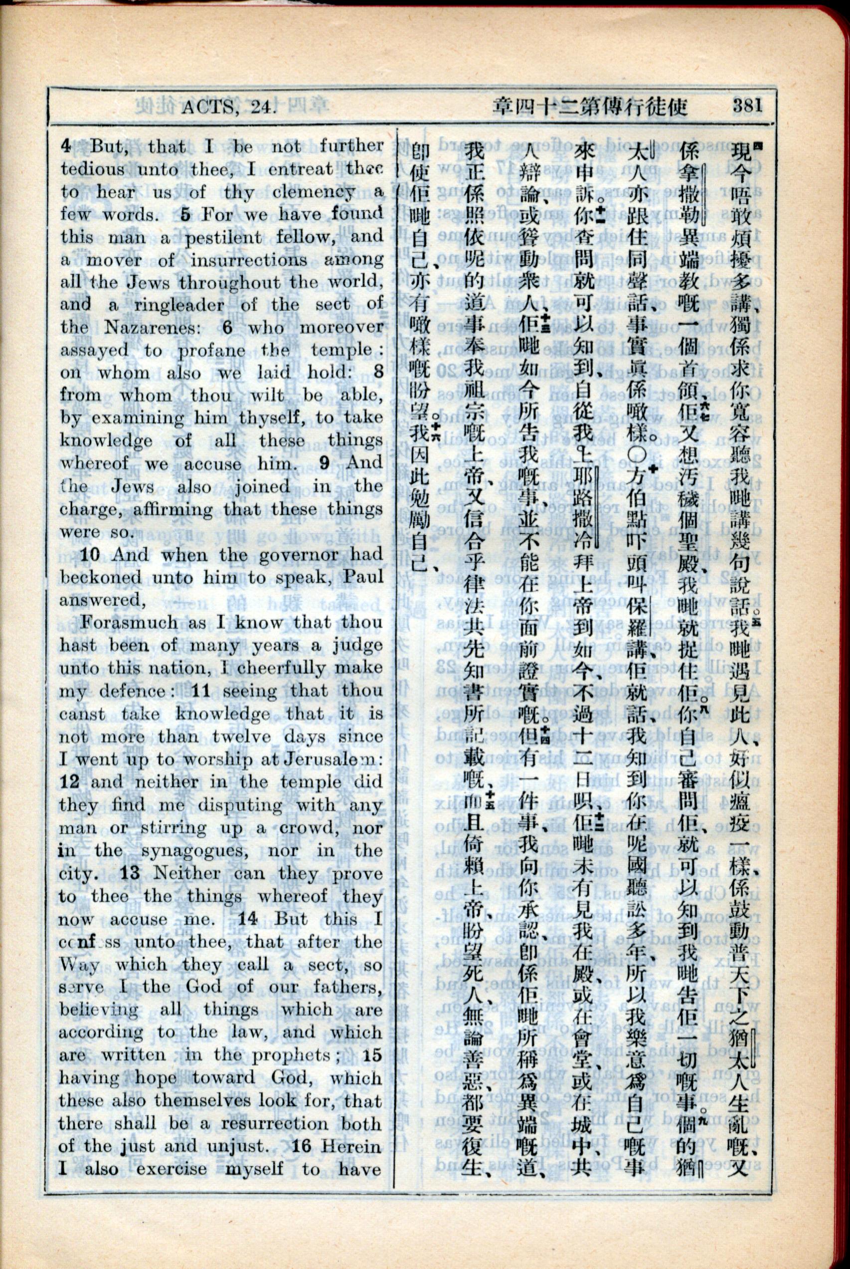 1931年新約全書廣東話新譯本與美國新譯英文 使徒行傳 24 章 4 節到 24 章 16 節