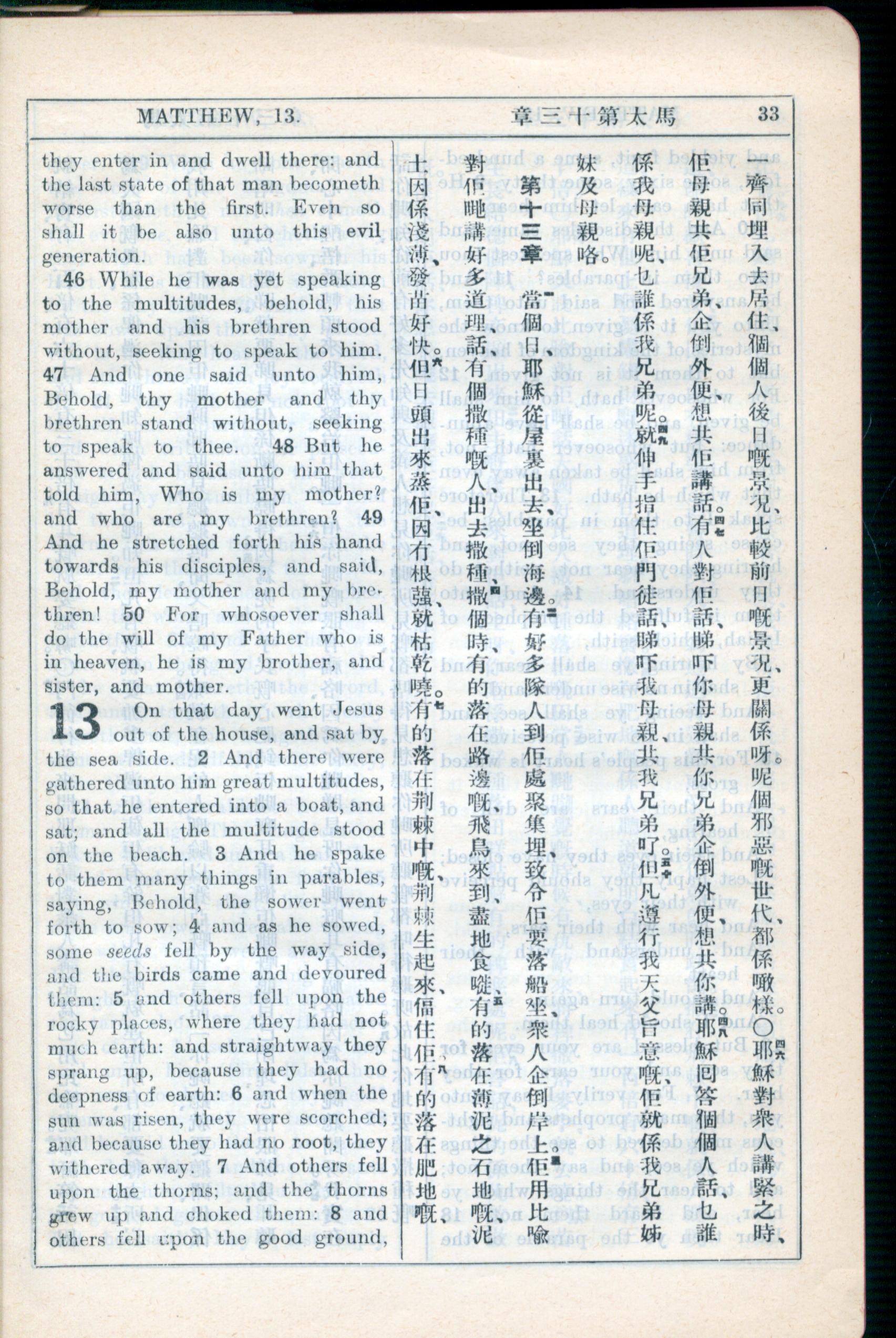 1931年新約全書廣東話新譯本與美國新譯英文 馬太福音 12 章 45 節到 13 章 8 節