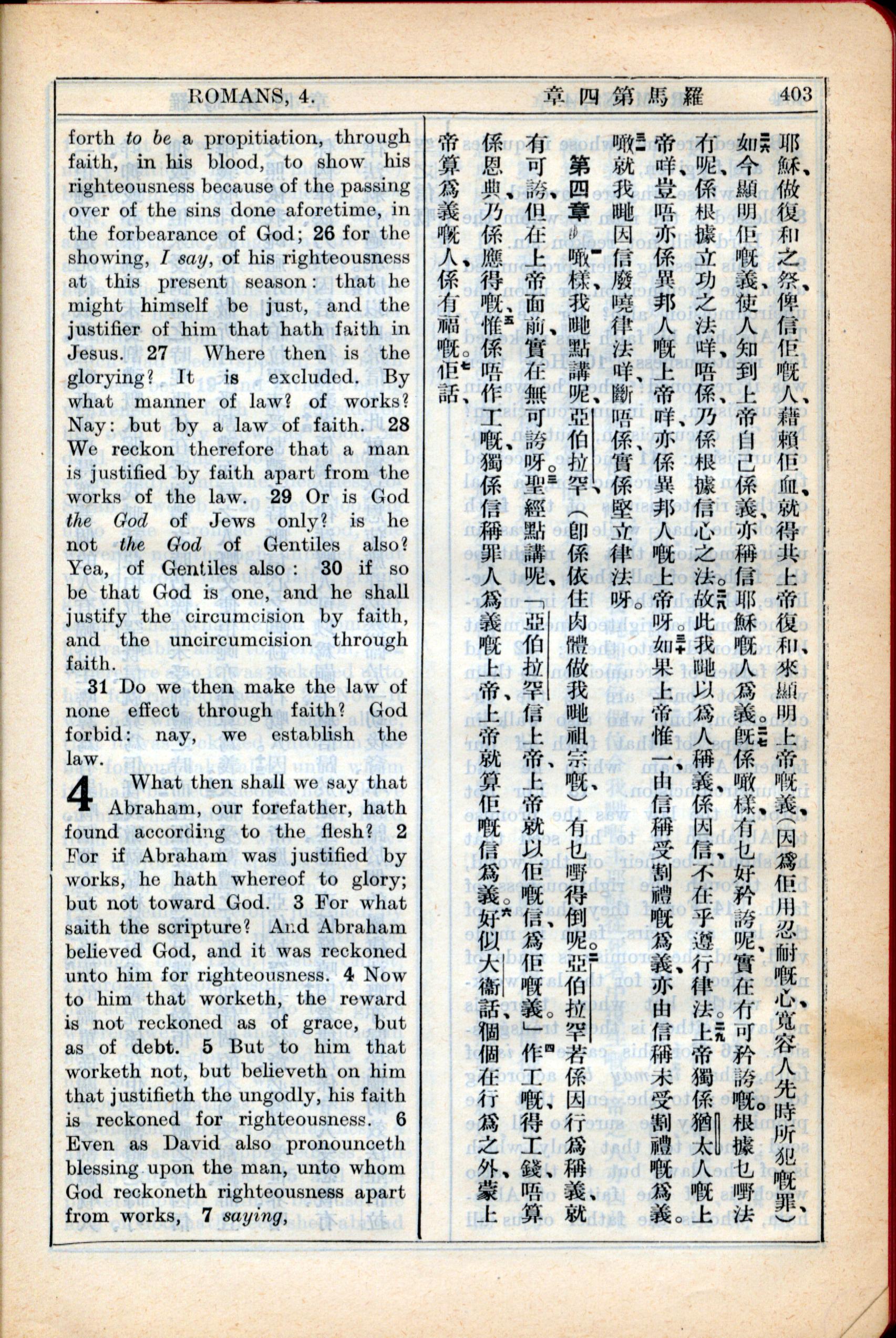 1931年新約全書廣東話新譯本與美國新譯英文 羅馬書 3 章 25 節到 4 章 6 節