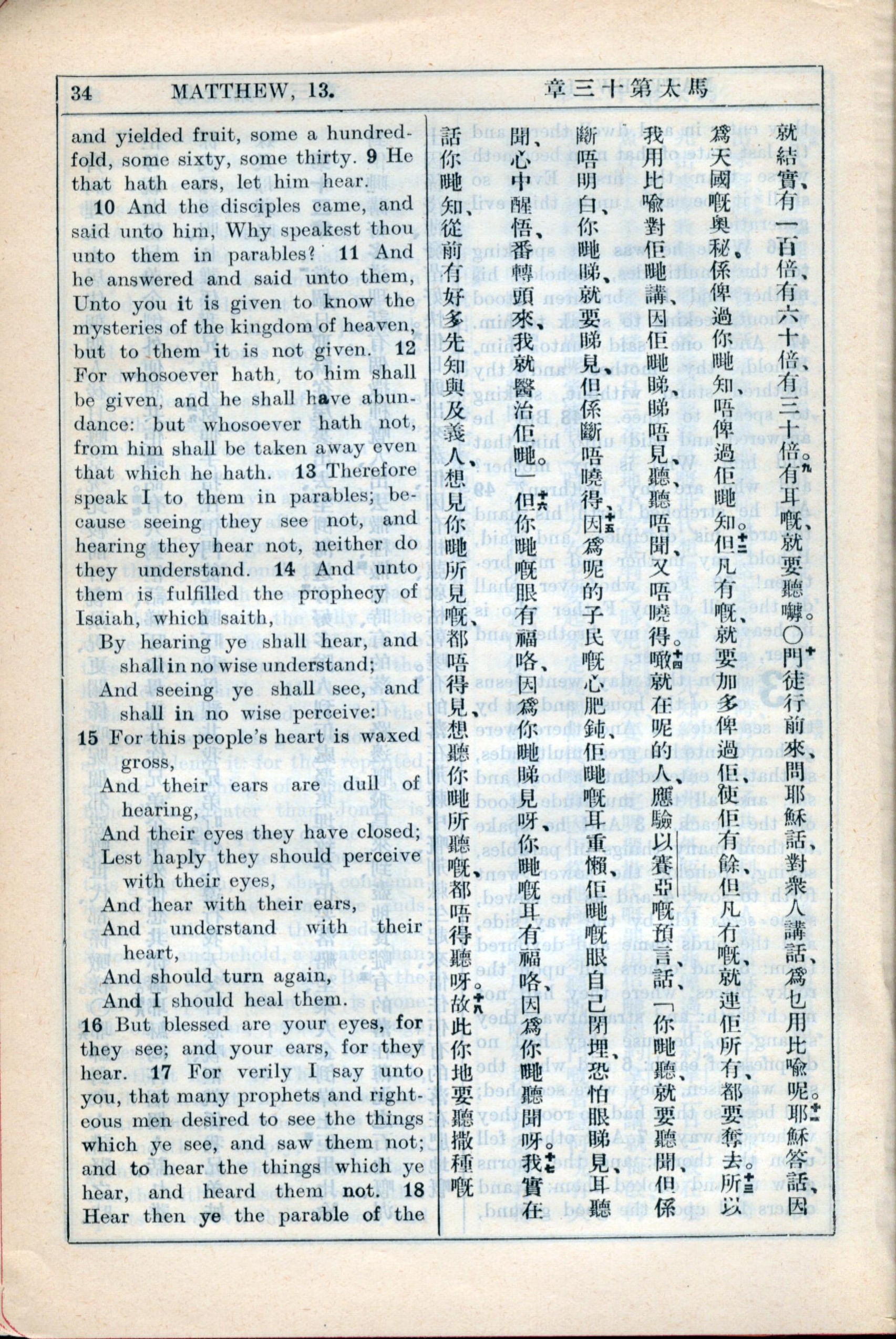1931年新約全書廣東話新譯本與美國新譯英文 馬太福音 13 章 9 節到 13 章 18 節
