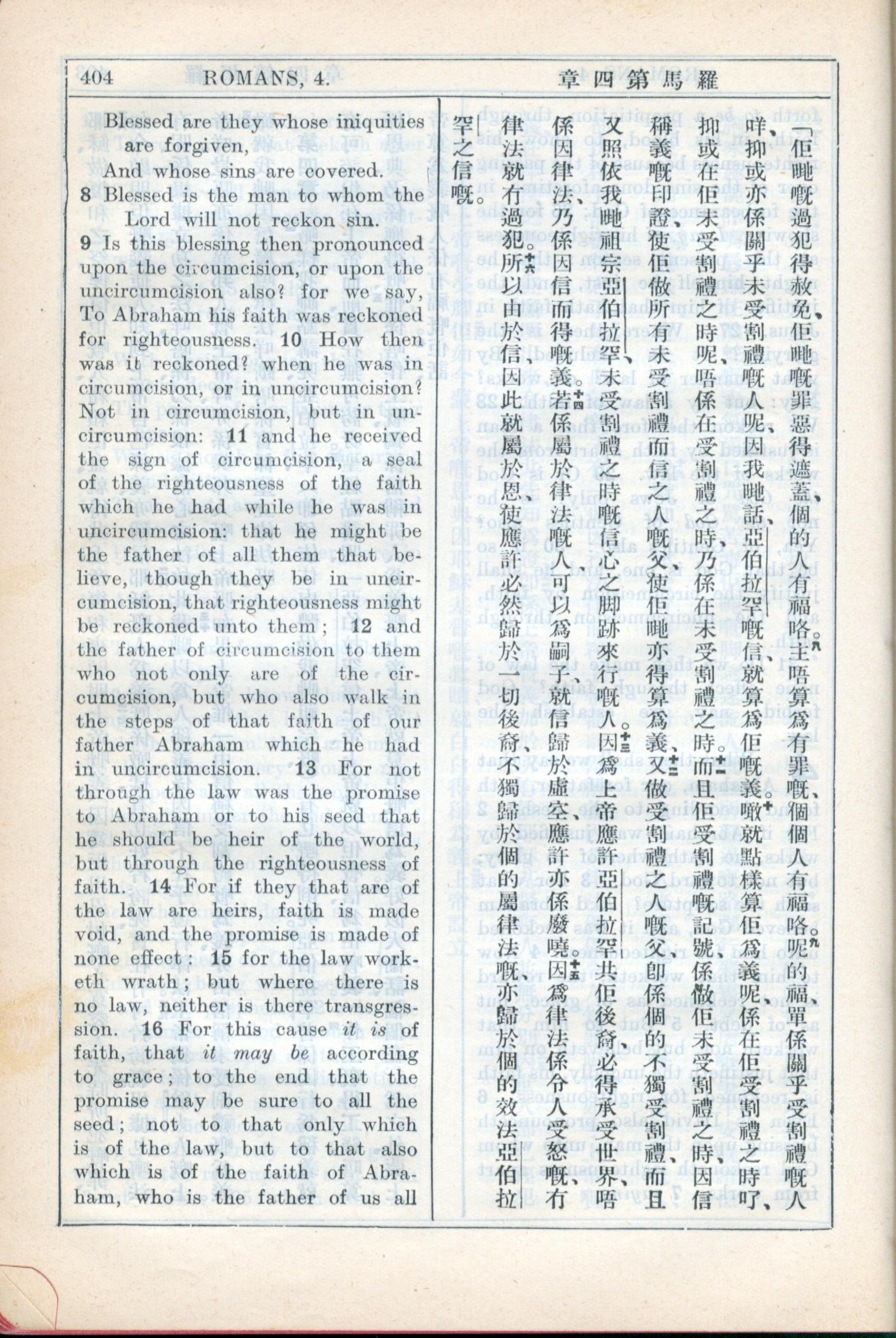 1931年新約全書廣東話新譯本與美國新譯英文 羅馬書 4 章 7 節到 4 章 16 節