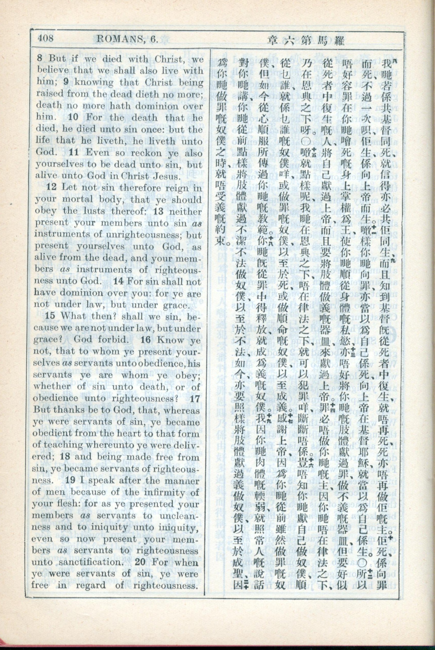 1931年新約全書廣東話新譯本與美國新譯英文 羅馬書 6 章 8 節到 6 章 20 節