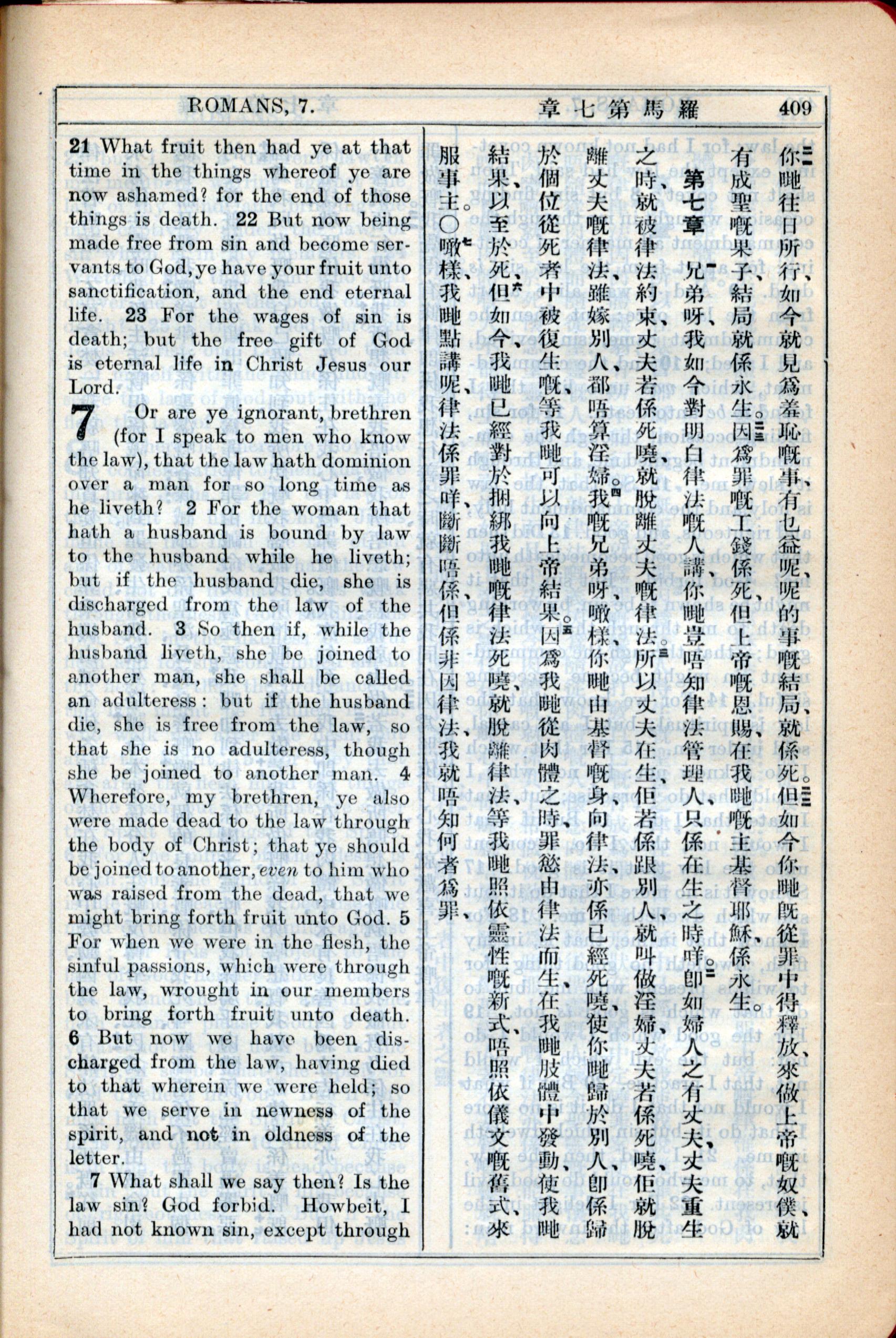 1931年新約全書廣東話新譯本與美國新譯英文 羅馬書 6 章 21 節到 7 章 7 節