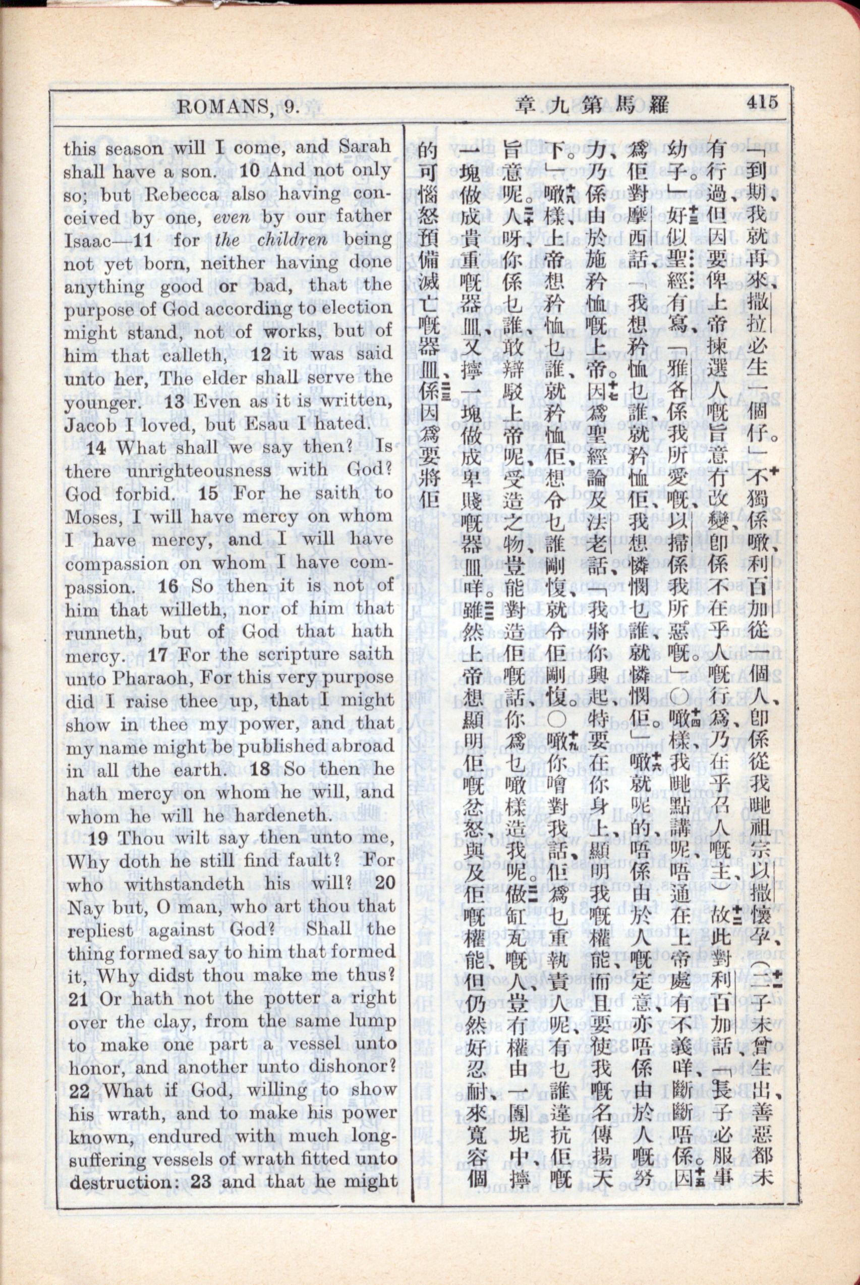 1931年新約全書廣東話新譯本與美國新譯英文 羅馬書 9 章 10 節到 9 章 22 節