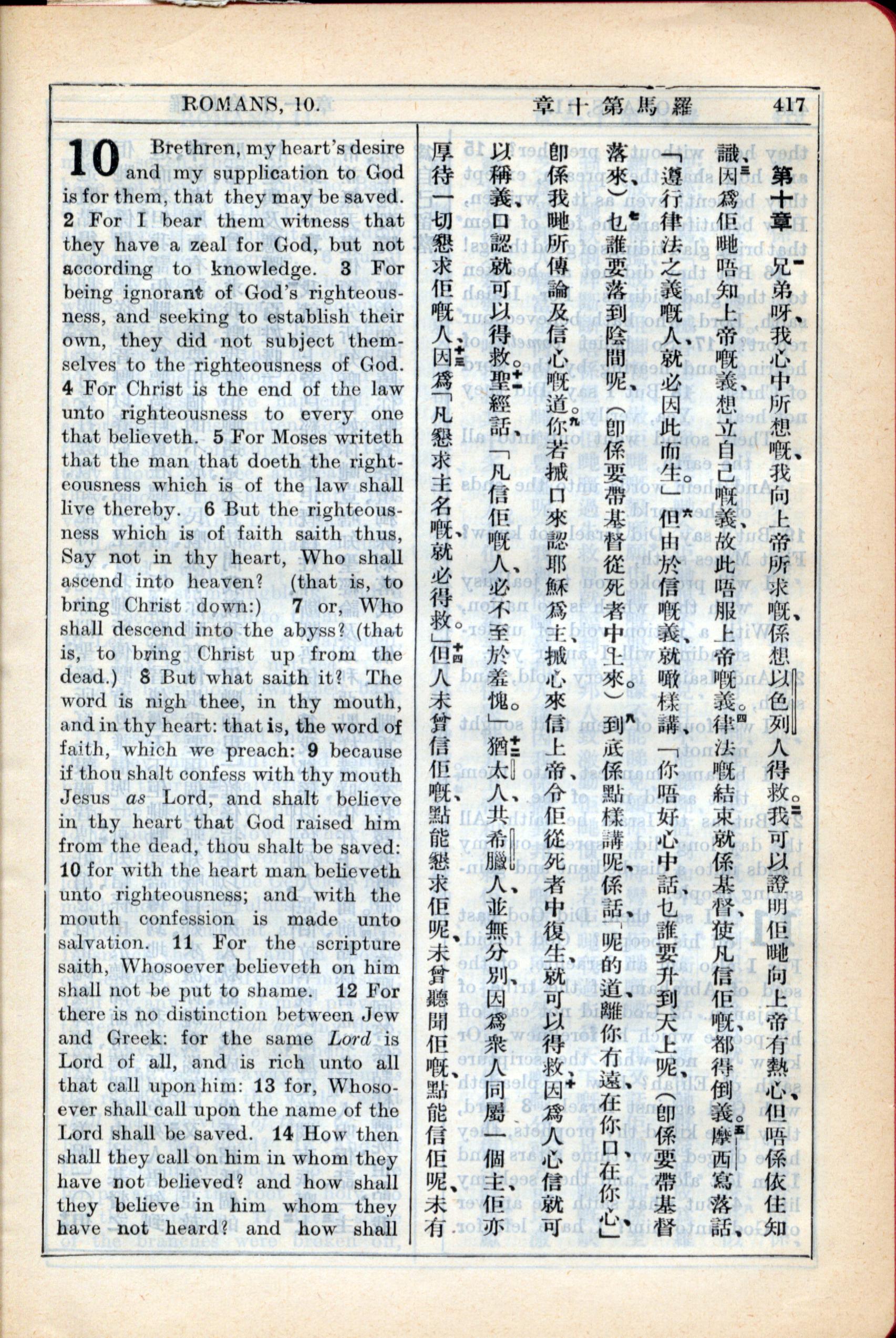 1931年新約全書廣東話新譯本與美國新譯英文 羅馬書 10 章 1 節到 10 章 14 節