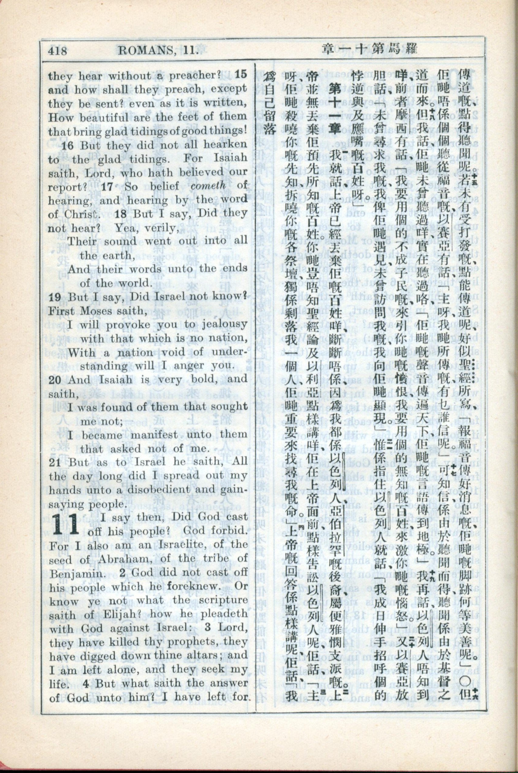 1931年新約全書廣東話新譯本與美國新譯英文 羅馬書 10 章 15 節到 11 章 4 節