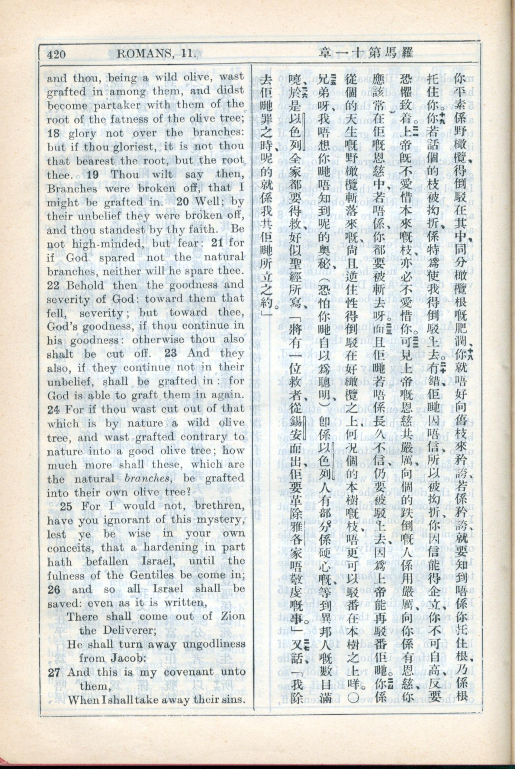 1931年新約全書廣東話新譯本與美國新譯英文 羅馬書 11 章 18 節到 11 章 27 節