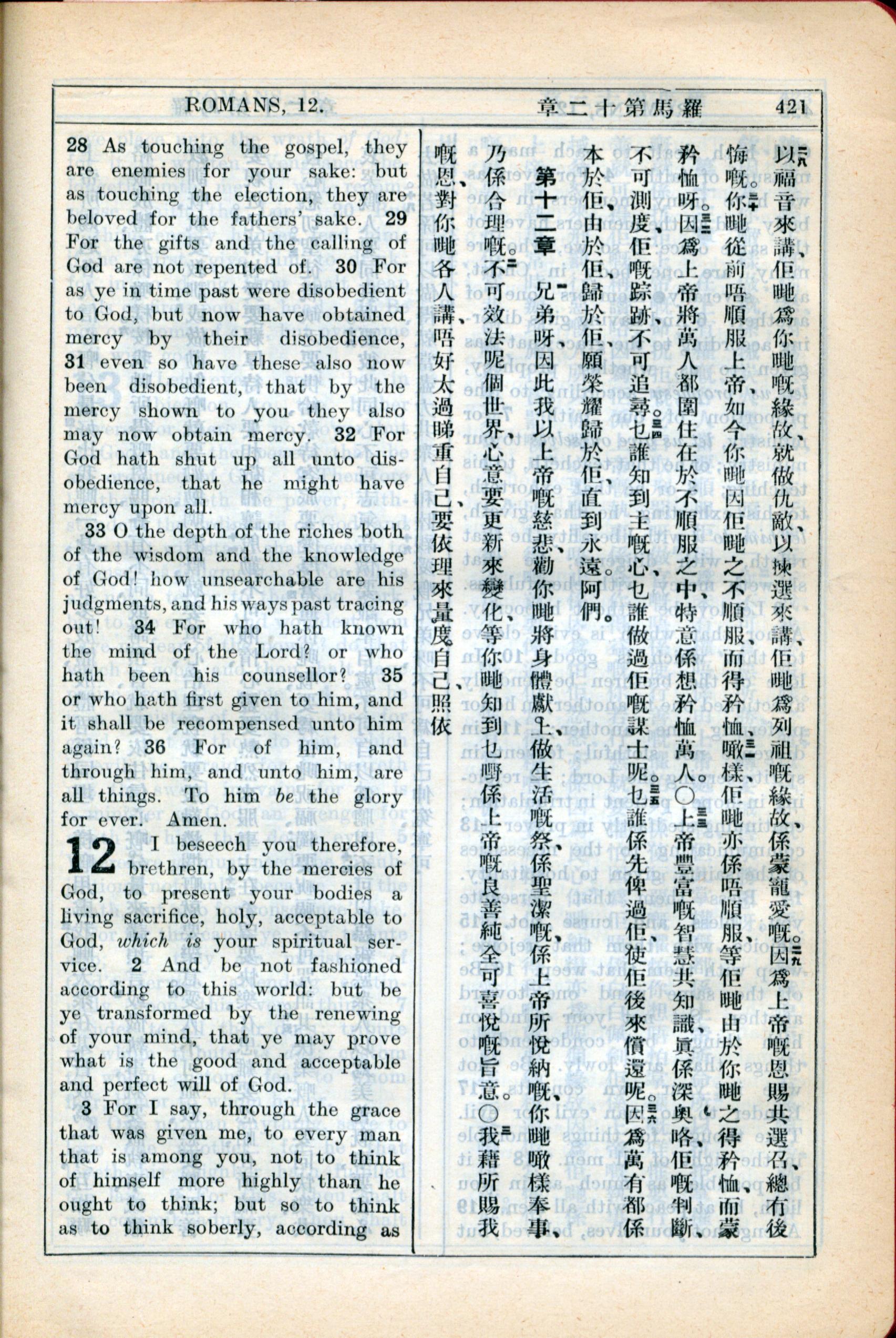 1931年新約全書廣東話新譯本與美國新譯英文 羅馬書 11 章 28 節到 12 章 3 節