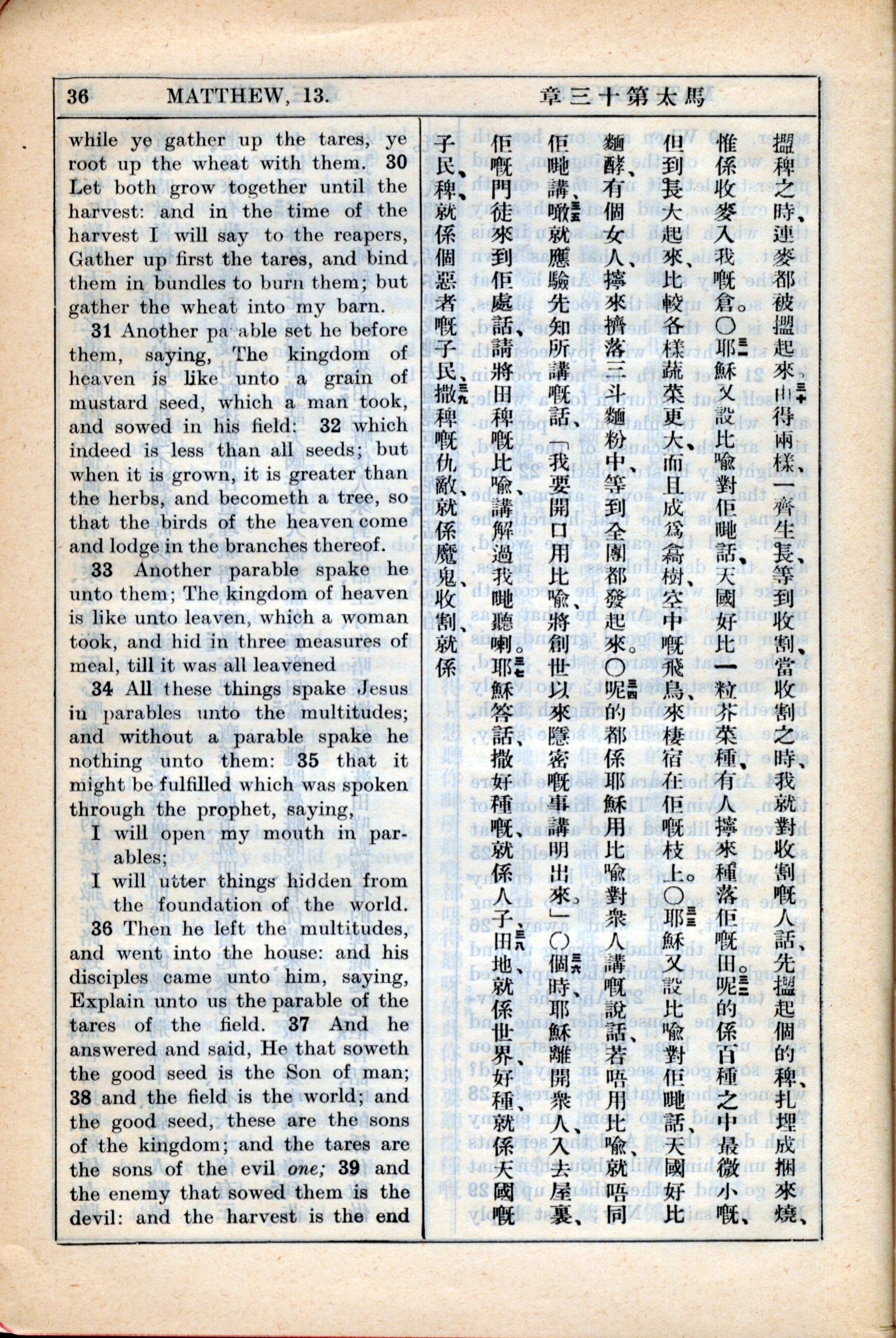 1931年新約全書廣東話新譯本與美國新譯英文 馬太福音 13 章 30 節到 13 章 39 節