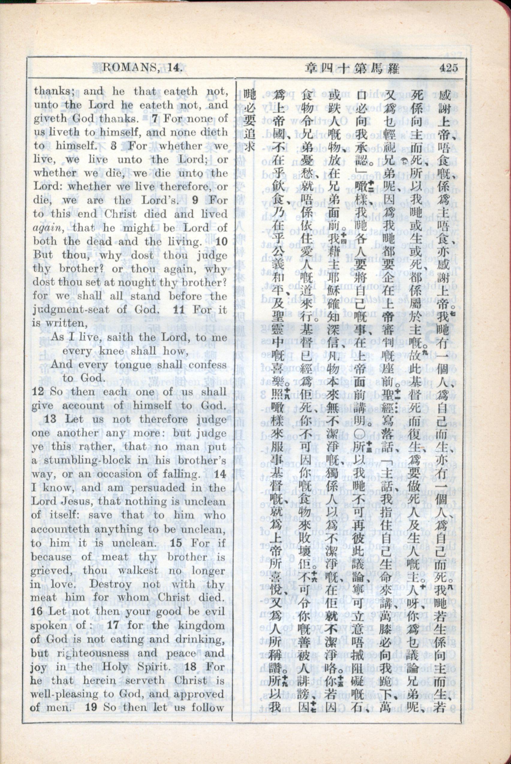 1931年新約全書廣東話新譯本與美國新譯英文 羅馬書 14 章 7 節到 14 章 19 節