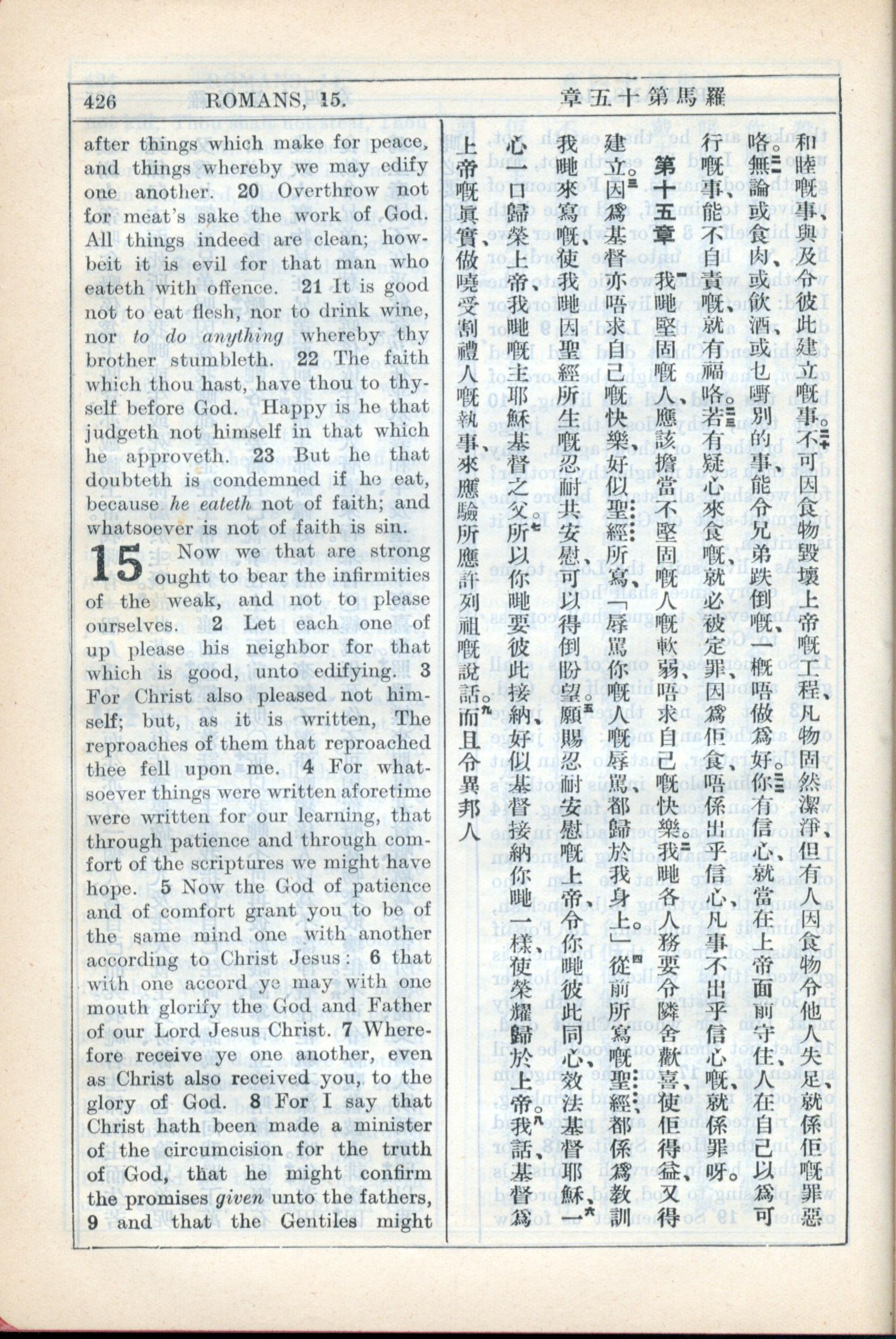 1931年新約全書廣東話新譯本與美國新譯英文 羅馬書 14 章 20 節到 15 章 8 節