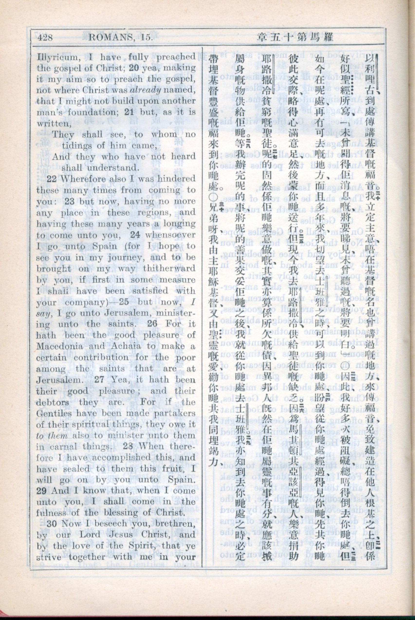 1931年新約全書廣東話新譯本與美國新譯英文 羅馬書 15 章 20 節到 15 章 30 節