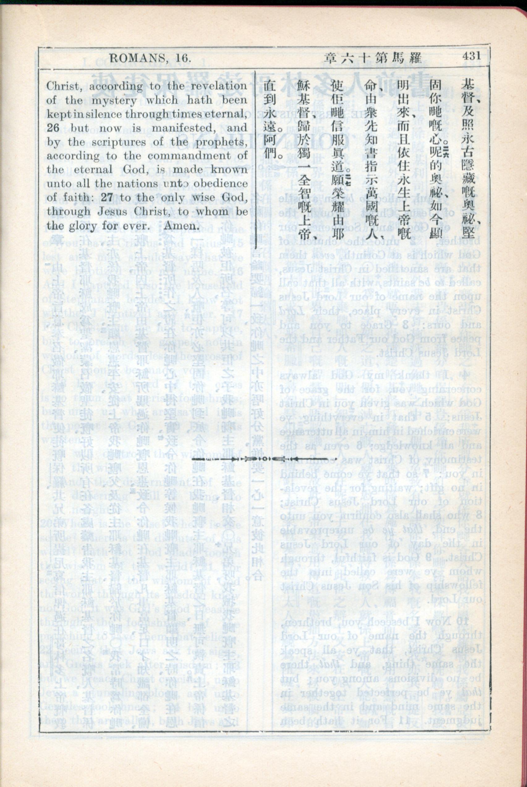 1931年新約全書廣東話新譯本與美國新譯英文 羅馬書 16 章 26 節到 16 章 27 節
