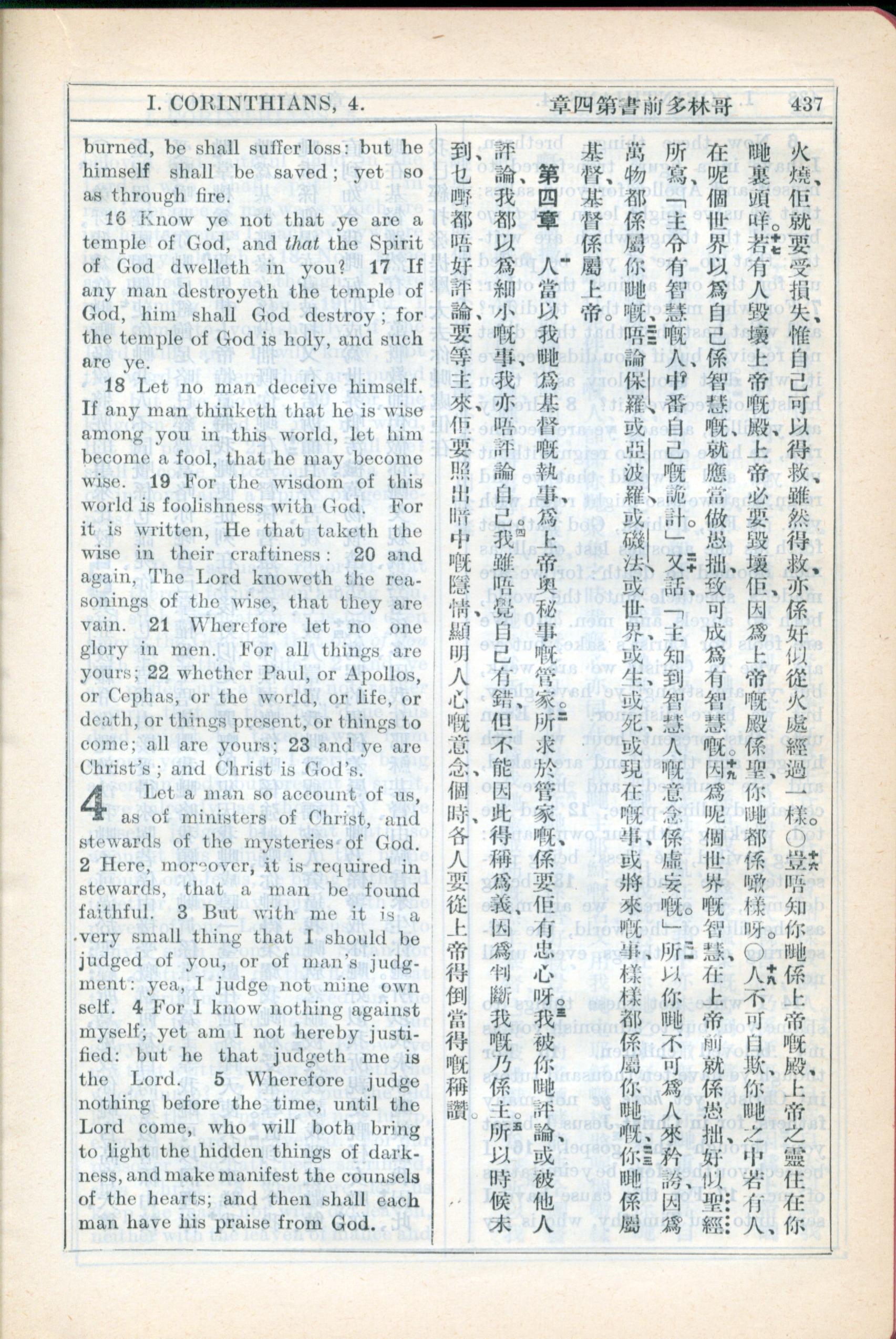 1931年新約全書廣東話新譯本與美國新譯英文 哥林多前書 3 章 15 節到 4 章 5 節