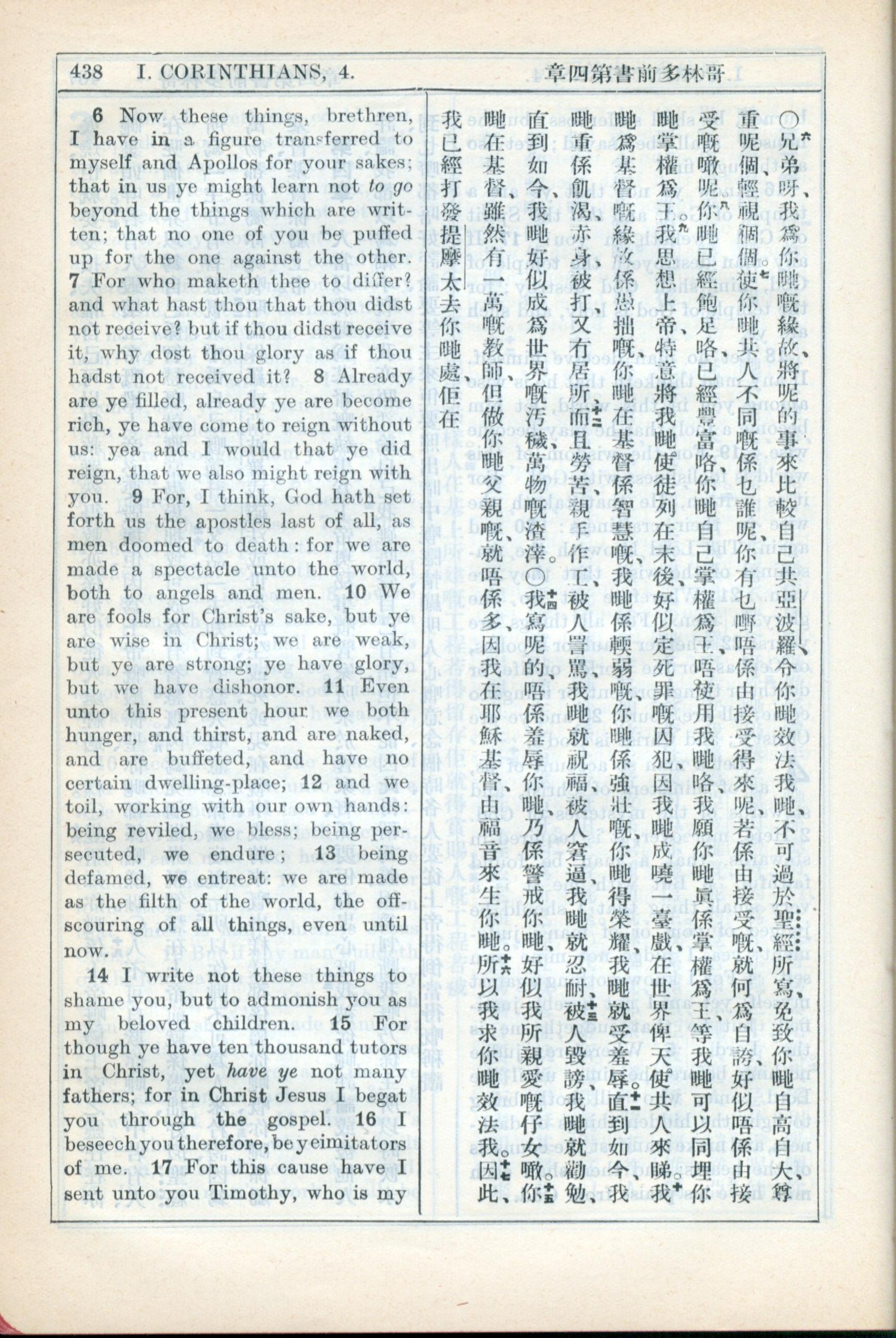 1931年新約全書廣東話新譯本與美國新譯英文 哥林多前書 4 章 6 節到 4 章 17 節