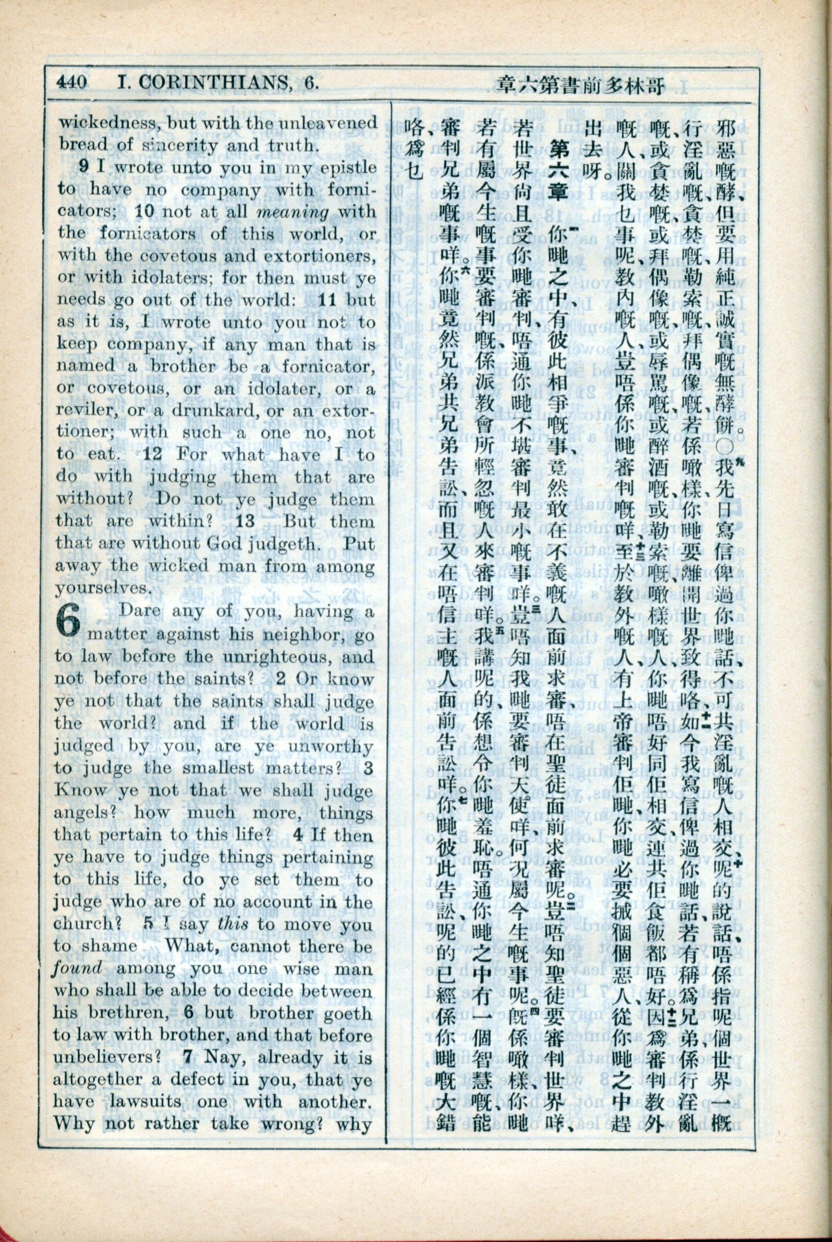1931年新約全書廣東話新譯本與美國新譯英文 哥林多前書 5 章 9 節到 6 章 7 節