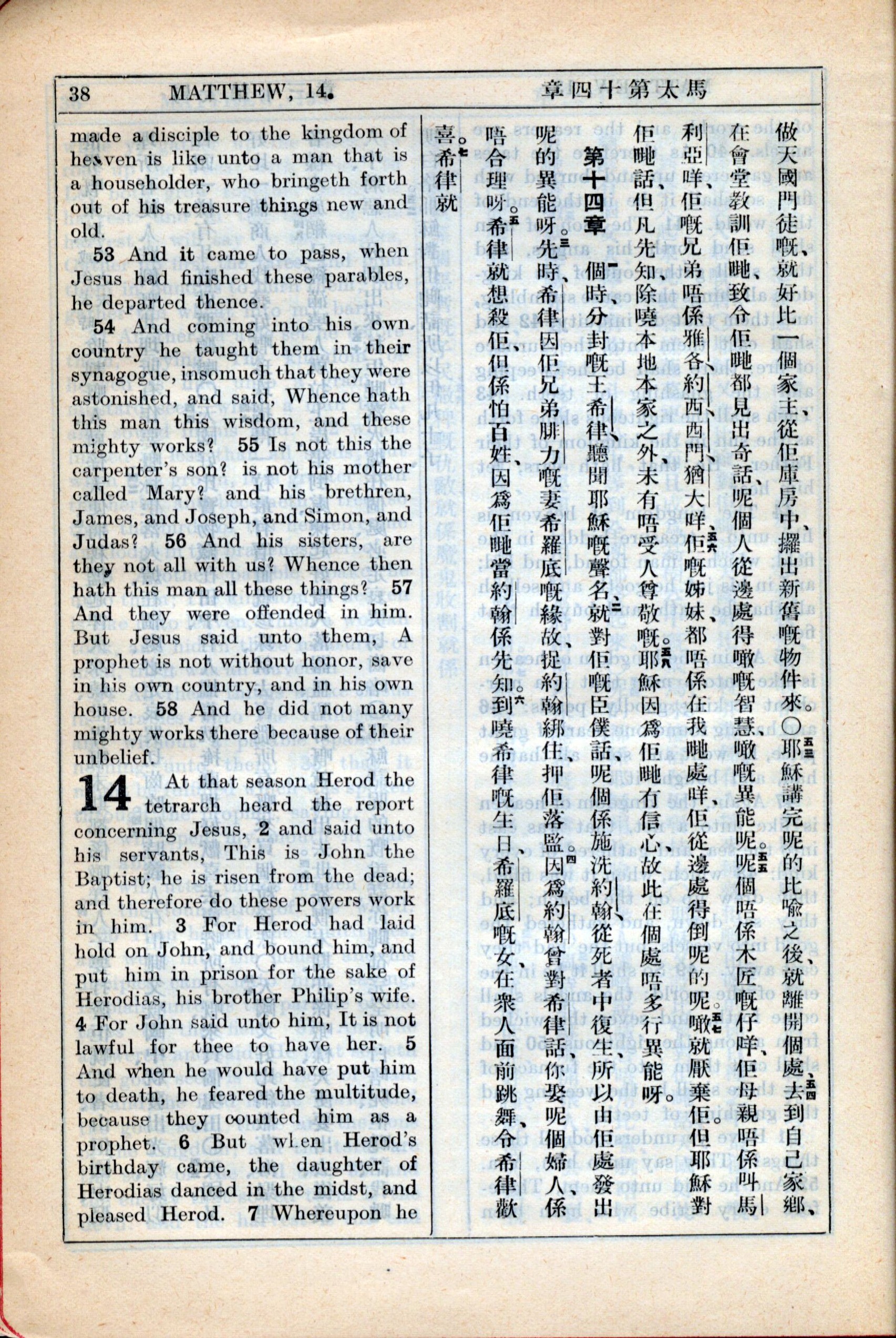 1931年新約全書廣東話新譯本與美國新譯英文 馬太福音 13 章 52 節到 14 章 6 節