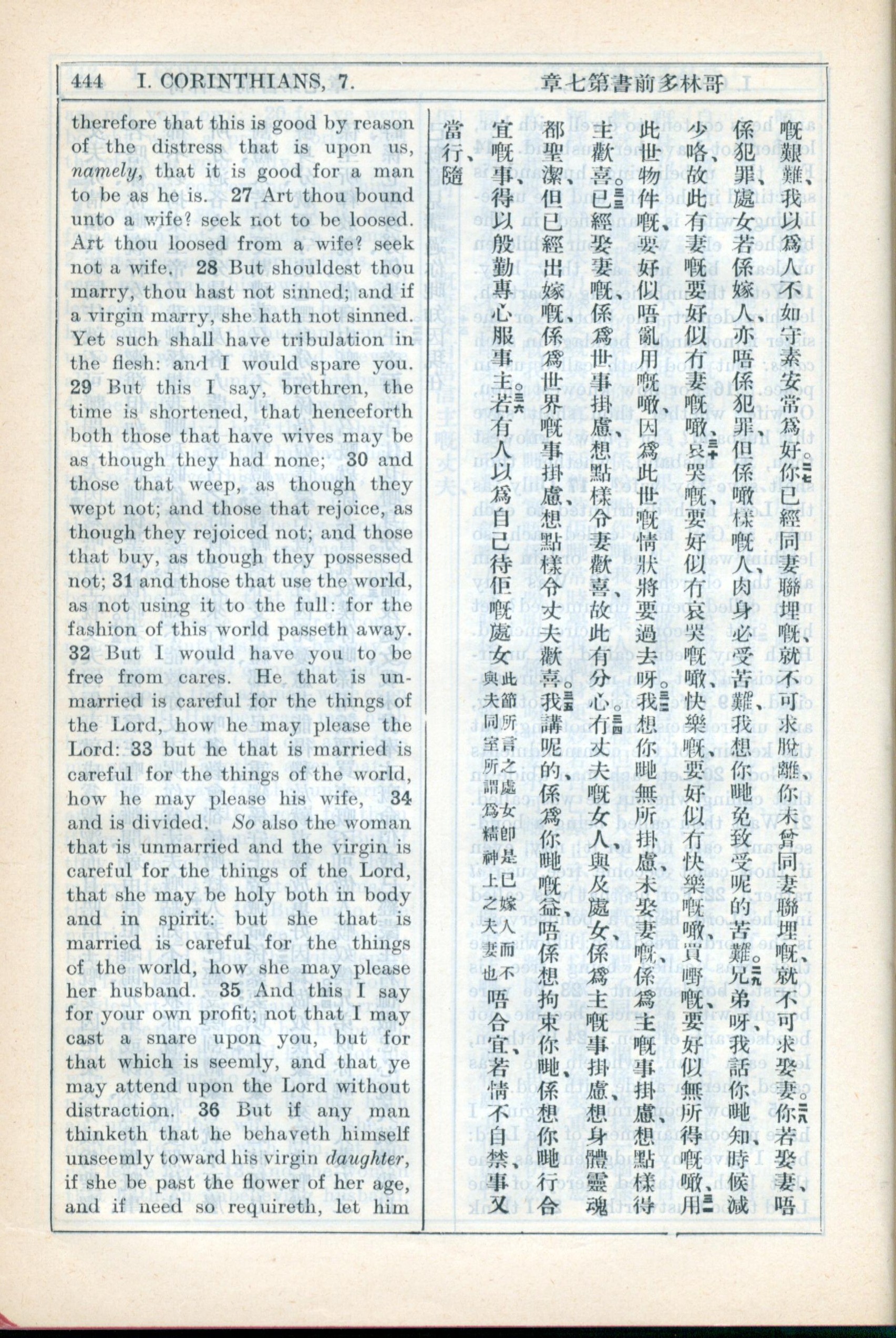 1931年新約全書廣東話新譯本與美國新譯英文 哥林多前書 7 章 26 節到 7 章 36 節